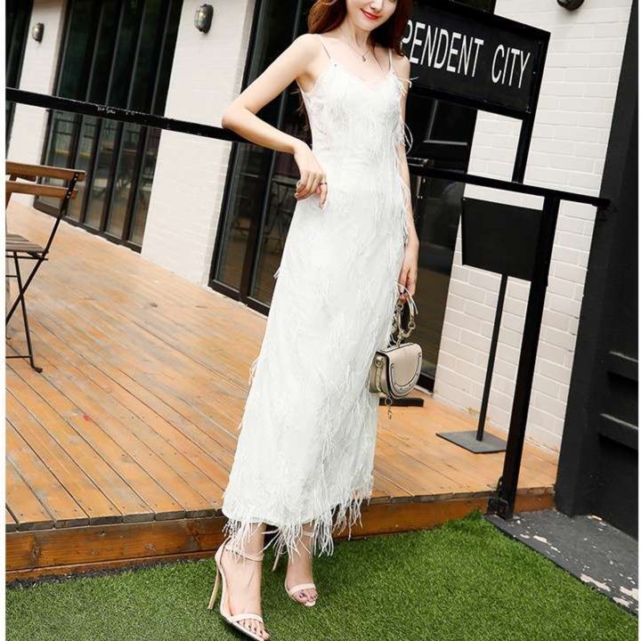 贅沢なフェザーフリンジが全体にあしらわれた白いワンピースは、春のパーティーシーンにぴったりです。