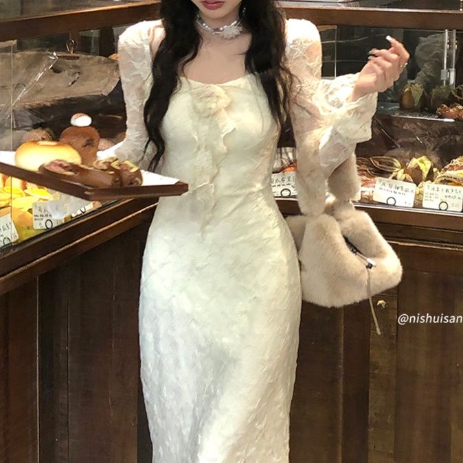 繊細な花刺繍が施された白レースワンピースです。