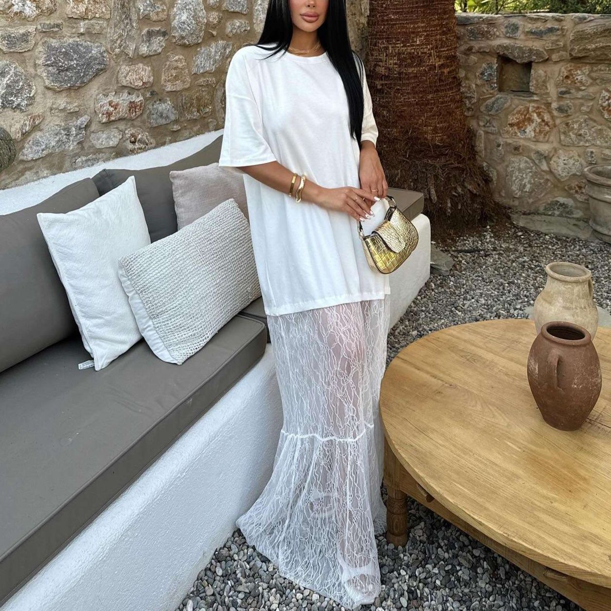 コットン素材ならではの適度な透け感と光沢感が、白レースワンピースの魅力を最大限に引き出しています。