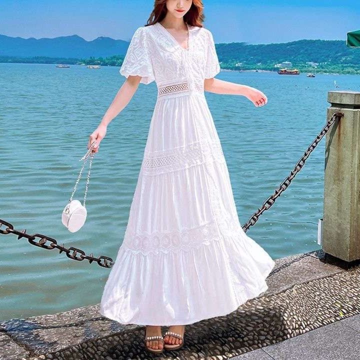 韓国風レース編み白ロングワンピース マキシ丈ロマンティックデザイン