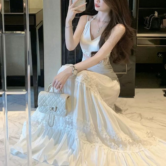 しなやかな生地感と繊細なレース使いが魅力の白ワンピース。