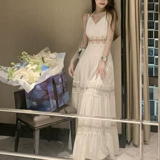 ウエスト部分のレース切替えがアクセントとなり、ロングタイプのマキシワンピが女性らしい優雅な雰囲気を醸し出します。