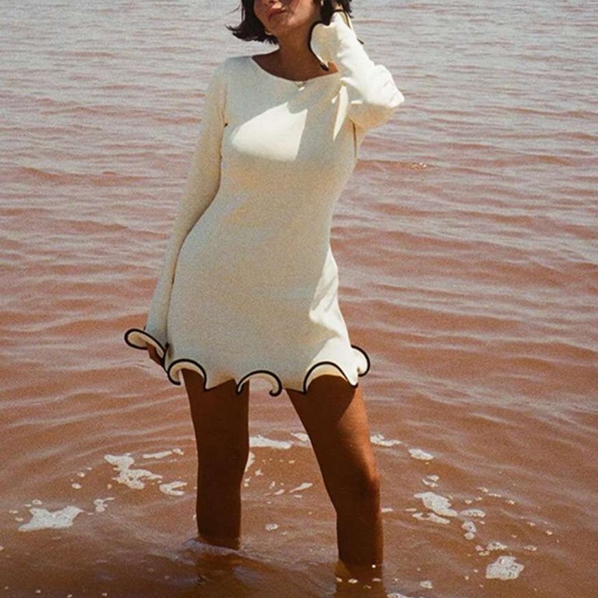 長袖の白ワンピースは、裾と袖口に施されたウェーブフリルでドレッシーな印象です。