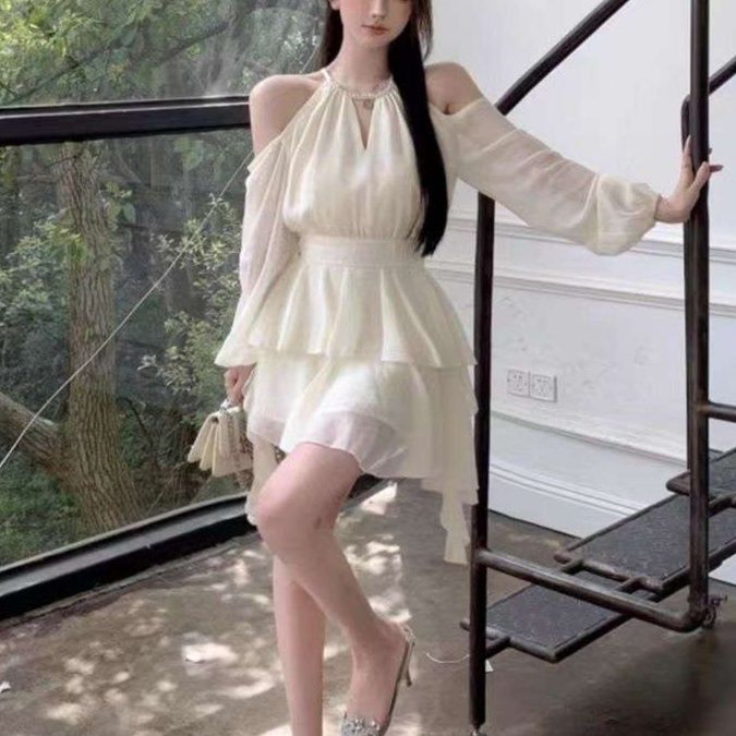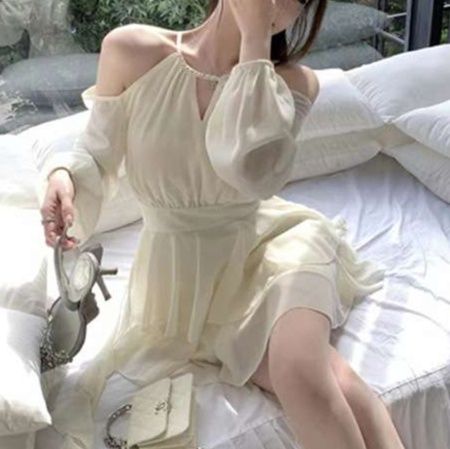 優雅な肩見せデザインが魅力的な白ワンピース。