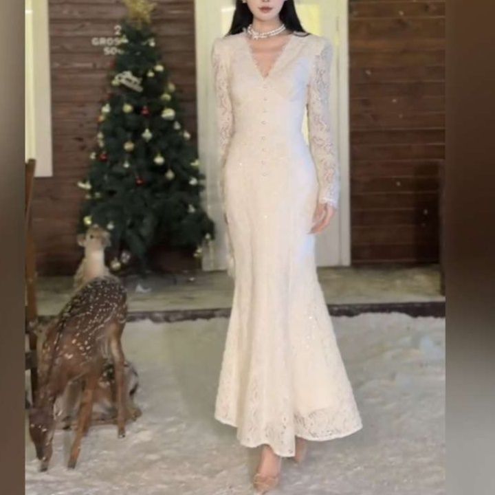 Vネックラインとマキシワンピの裾のマーメイドラインが、上品かつ華やかな印象を与えます。