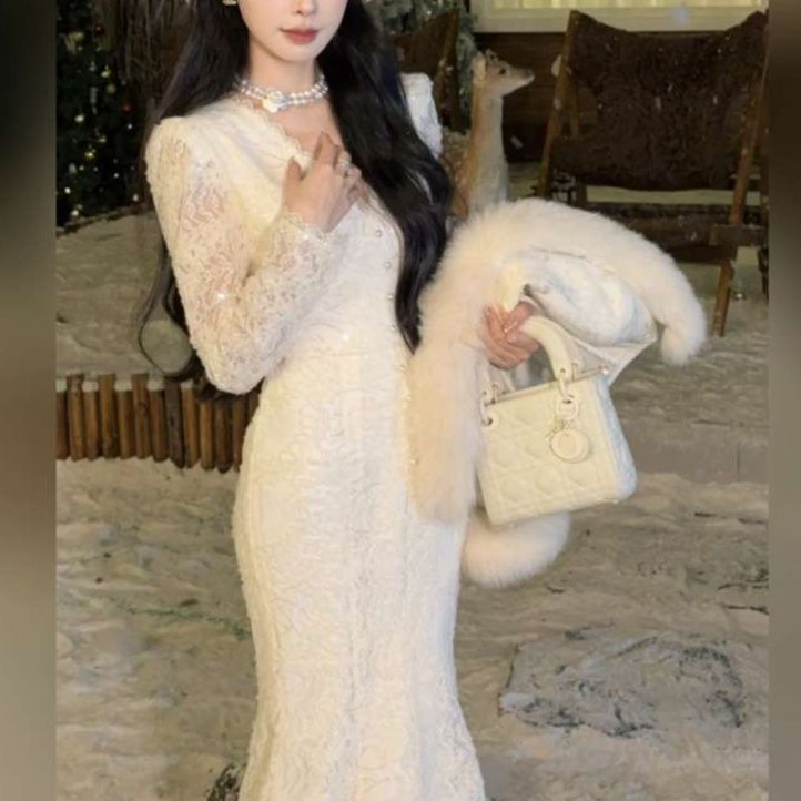 ロングタイプの長袖レースデザインは、細身のシルエットで気品ある女性らしさを演出。