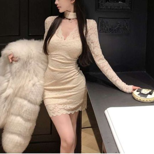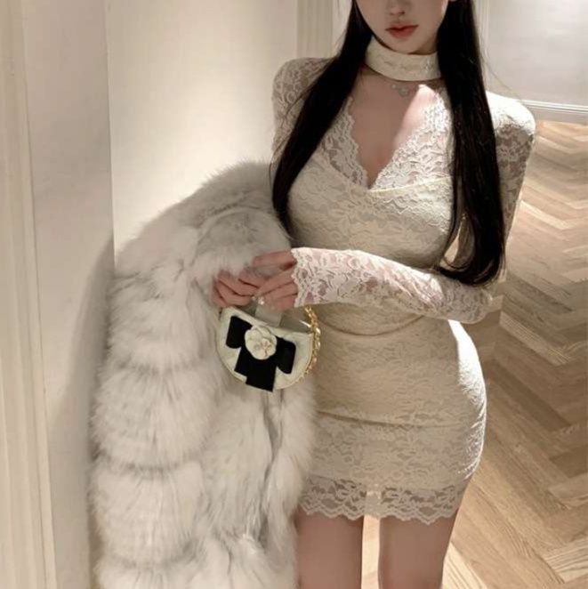 全体に施された美しいレース素材が女性らしい優雅さと洗練された雰囲気を演出