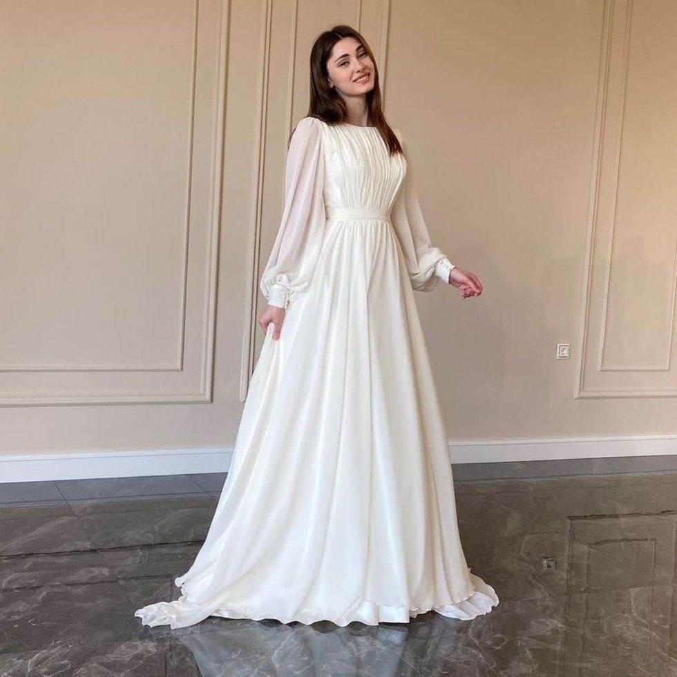 ふんわりとしたビショップスリーブとプリーツ加工が上品なマキシ丈のドレスタイプ。