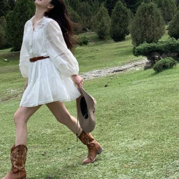 胸元から裾にかけて繊細なレース模様が施された上品な白ワンピース。