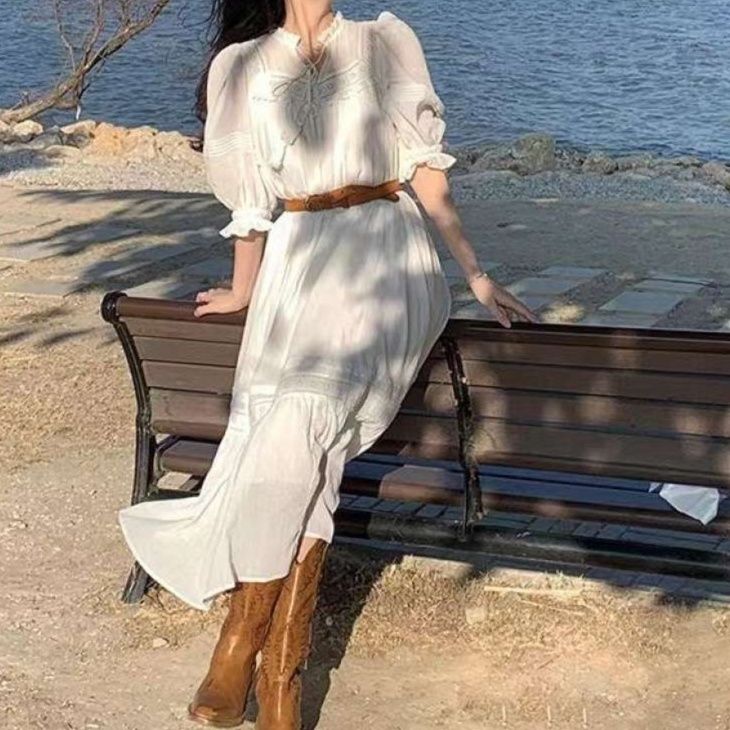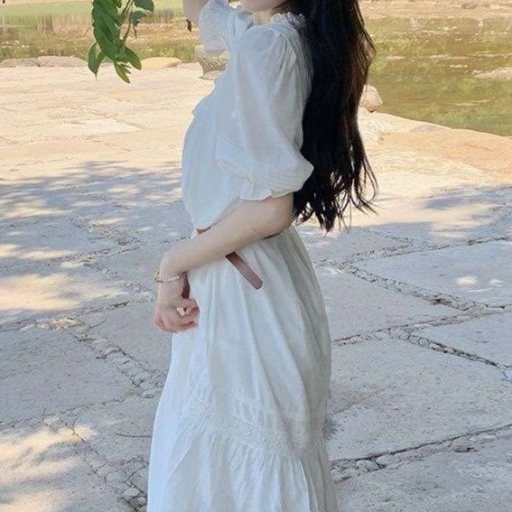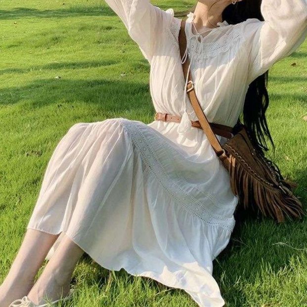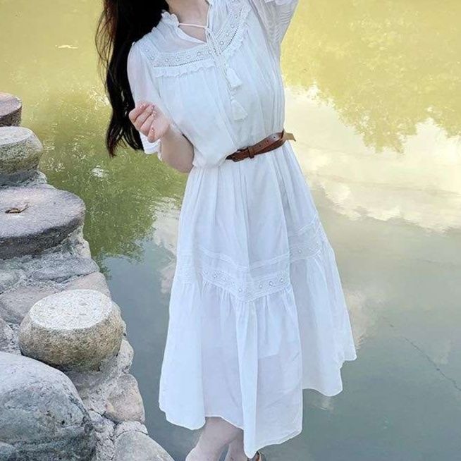 優美な襟元のタッセル飾りと裾のティアードデザインが、乙女心をくすぐる白ワンピースのミモレワンピとして日常からお出かけまで幅広く活躍します。