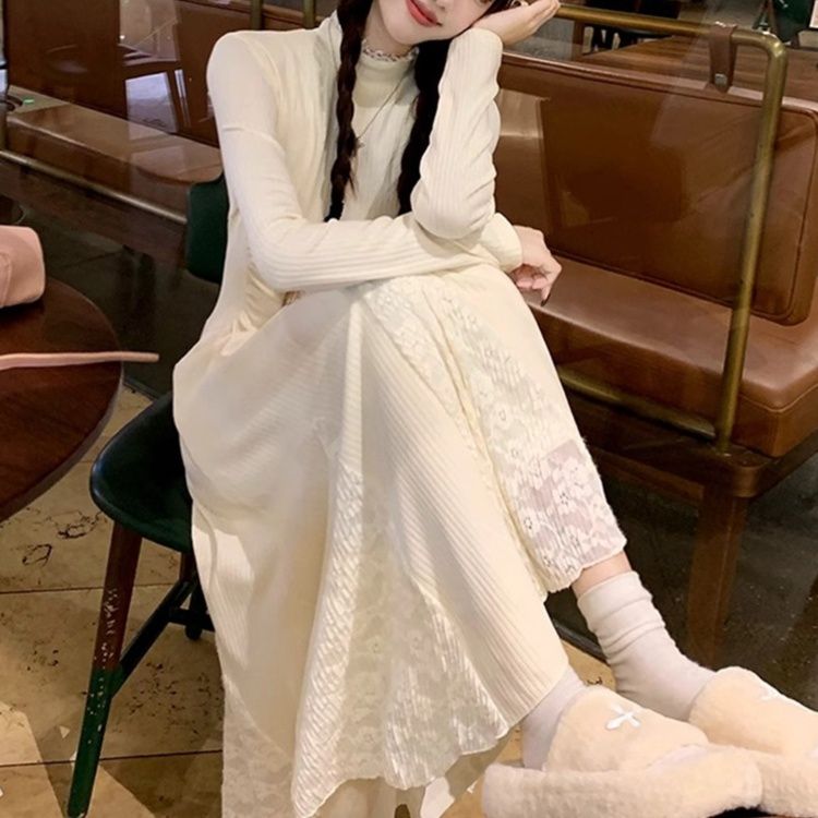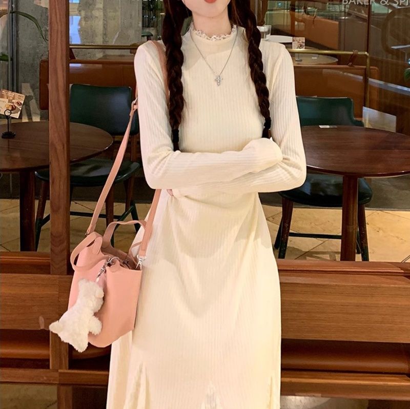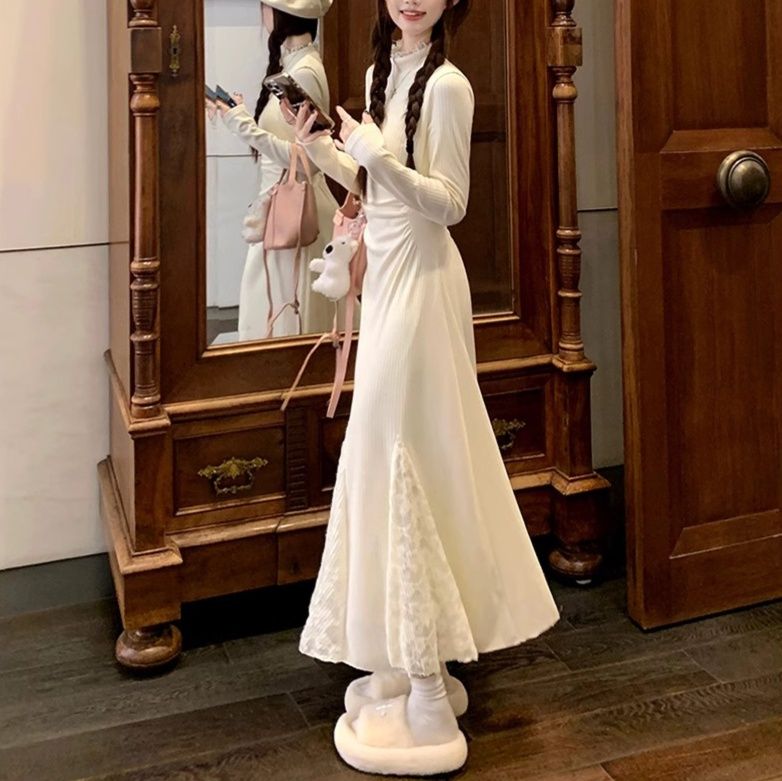 上品な長袖のニットワンピース。 裾部分のレース切替がエレガントな雰囲気を演出する白ワンピース。 足首まで届くロングデザインで、マキシワンピとしての優雅さが際立ちます。 すっきりとしたシルエットと繊細なレース模様が調和した一着です。