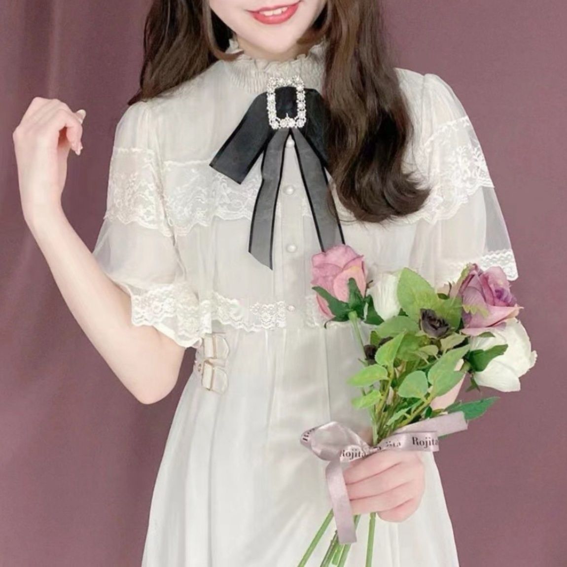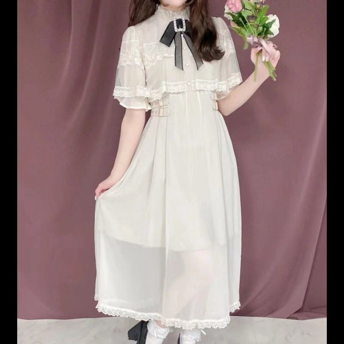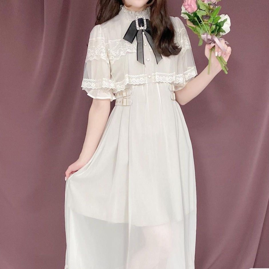 レース付きの襟元と装飾的なリボンが可愛らしさを演出し、袖のボリュームデザインがマキシワンピとして存在感抜群。