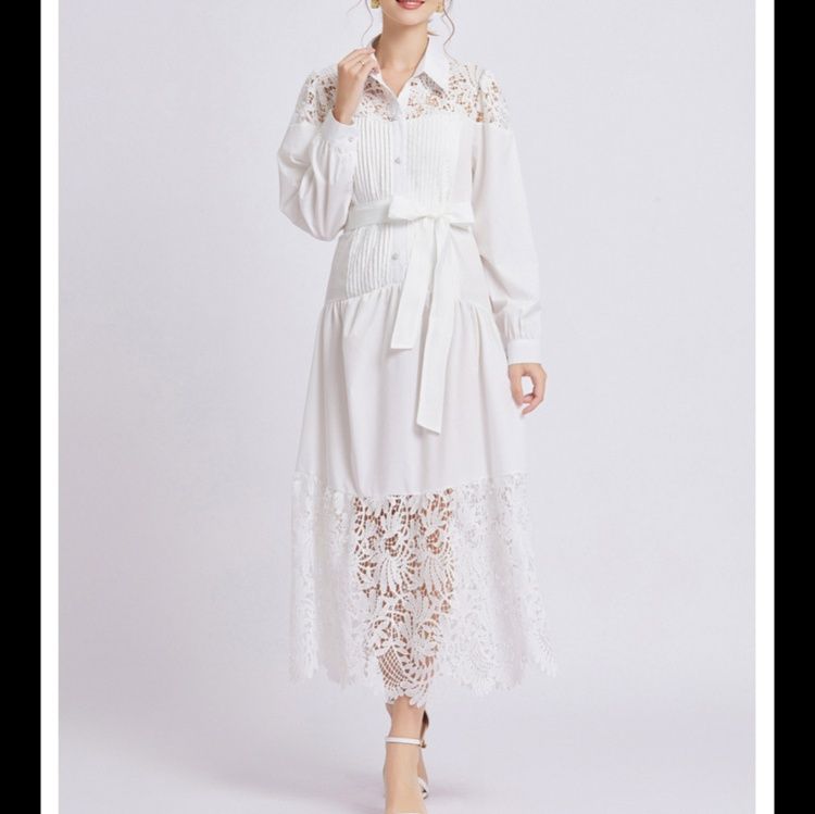 上品なレース切替とピンタックデザインが魅力的な白ワンピース。