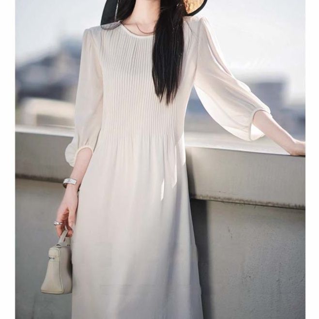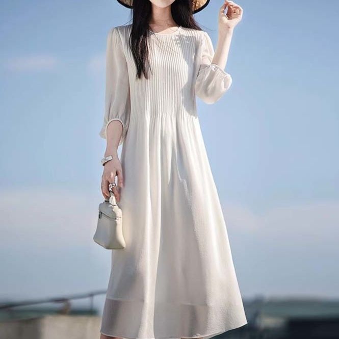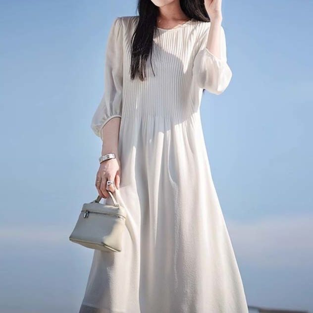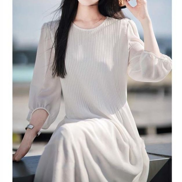 ふんわりとした七分袖とプリーツデザインが上品な白ワンピース。