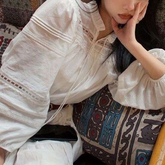 胸元のレース使いや袖のふんわりシルエットが女性らしさを引き立てます。