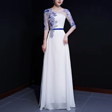 シースルーの袖に施された青い花の刺繍が、清楚で優美な雰囲気を演出しています。