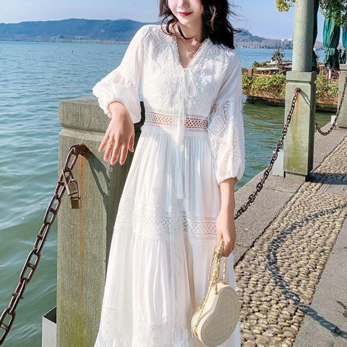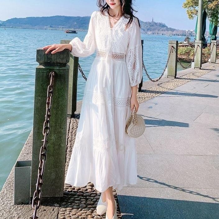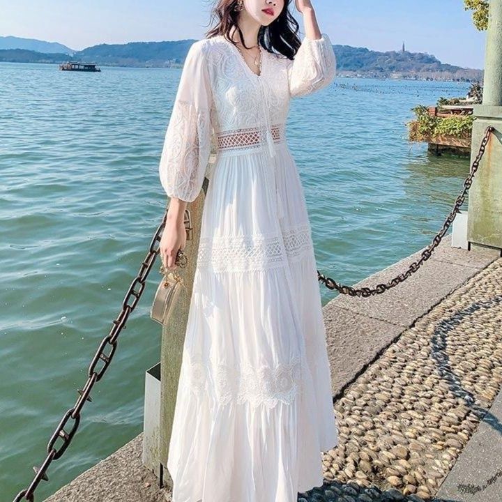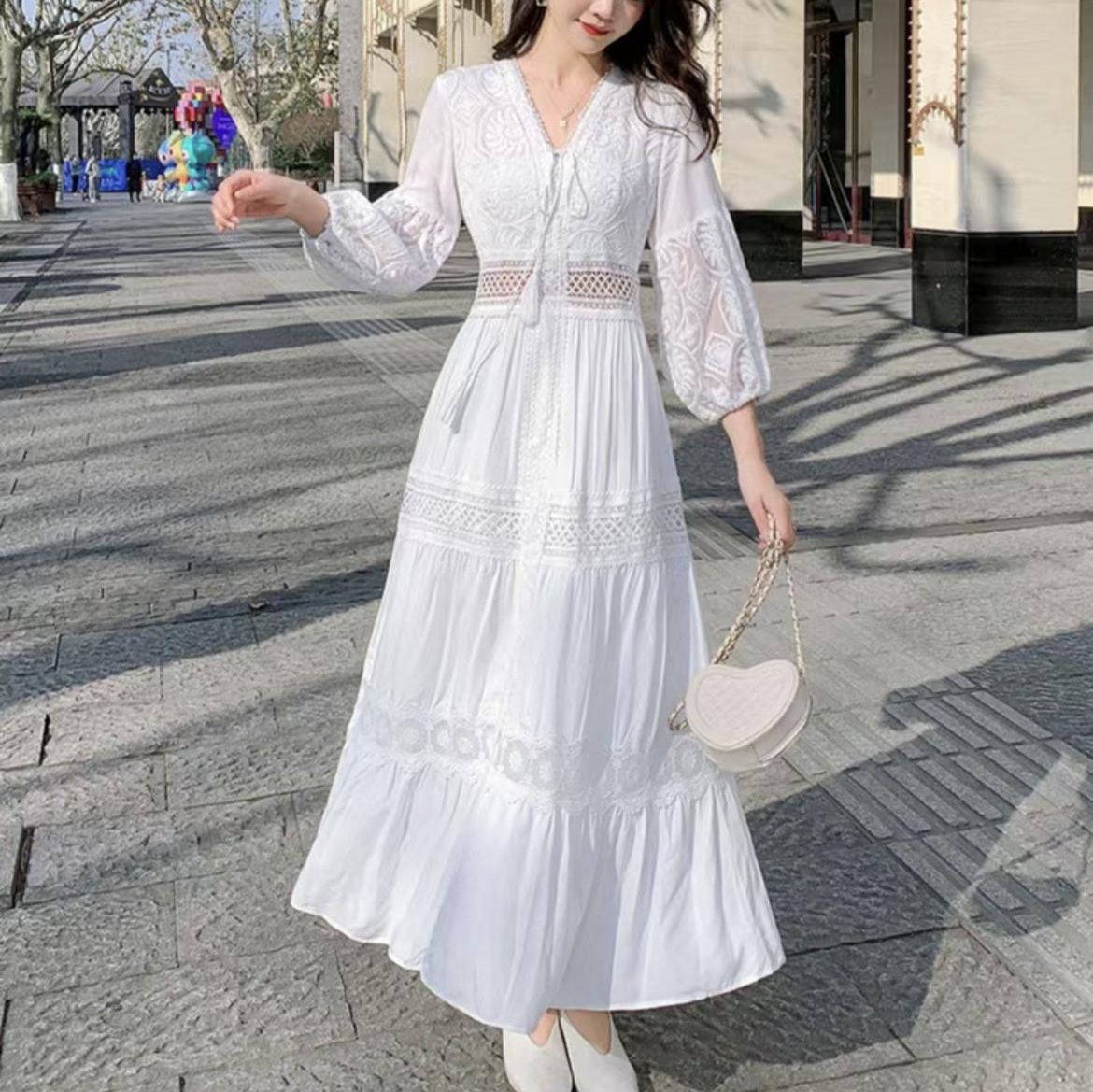 優雅な透かし編みレースと精巧な刺繍が魅力の白ワンピース。女性らしいシルエットを引き立てるバルーン袖とウエストマークが、ロング・マキシワンピの特長を際立たせる。リゾートやパーティーに最適な華やかなデザインが、特別な瞬間を演出する。上品さと可愛らしさを兼ね備えた一着で、心に残る思い出を作るお手伝いをします。