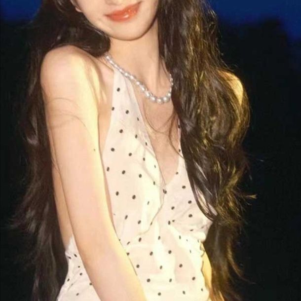 細かな水玉模様が全体的に散りばめられており、清楚で大人可愛らしい印象を演出します。