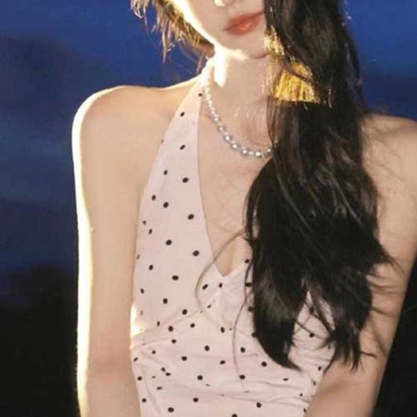 首元のホルターネックデザインが、デコルテラインを美しく見せつつ、優雅な雰囲気を醸し出します。