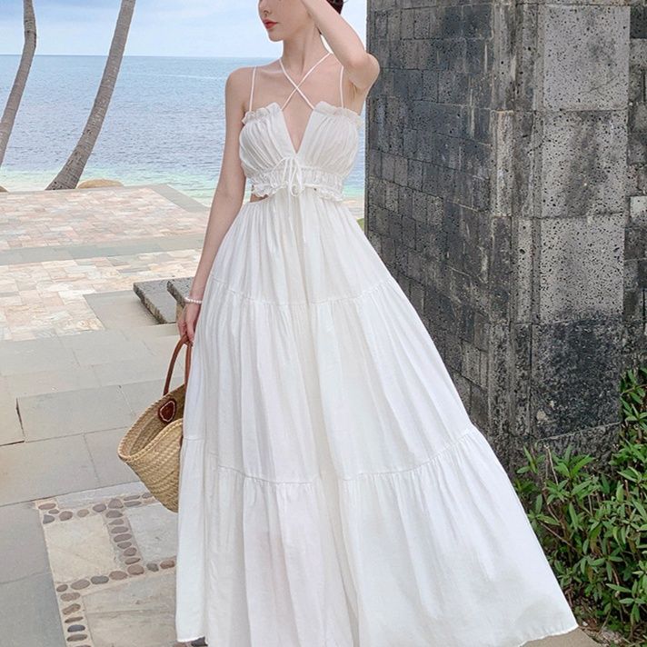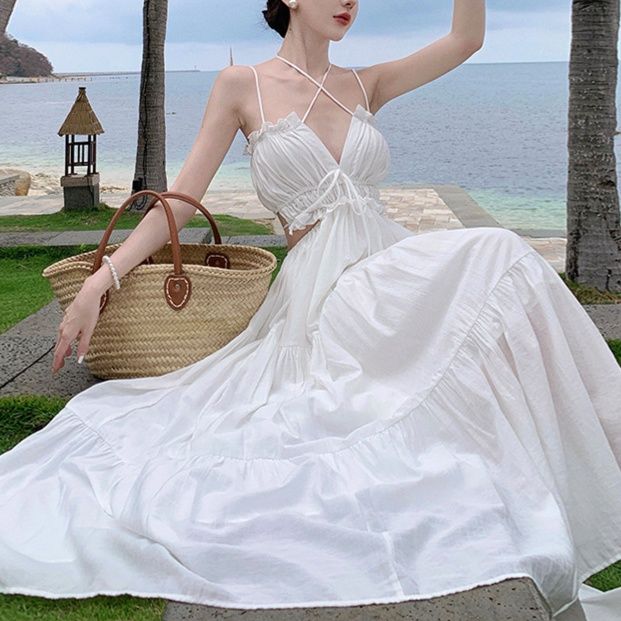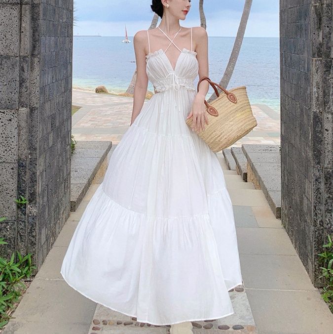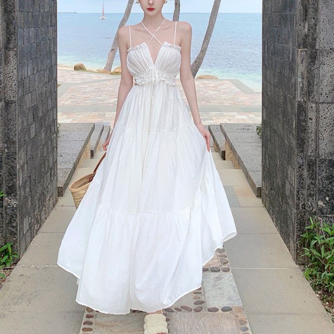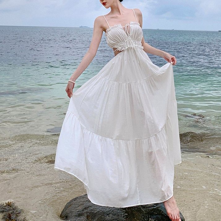 足元まで伸びるマキシワンピは、海辺のリゾートでも映える上質な素材感。