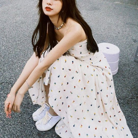 裾のフリルデザインがスニーカーとの相性が良く、カジュアルながら女性らしさを引き立てます。
