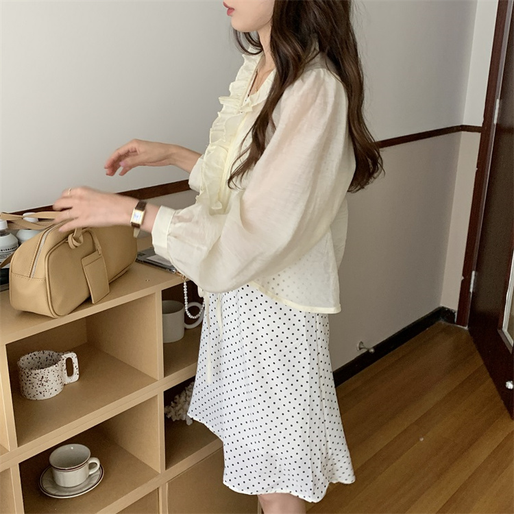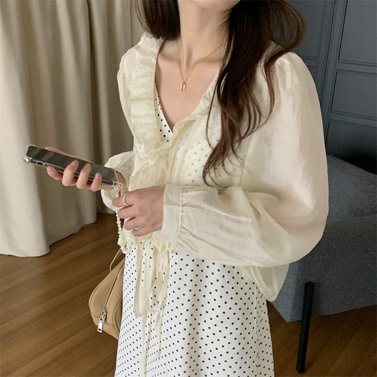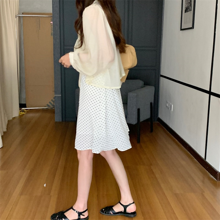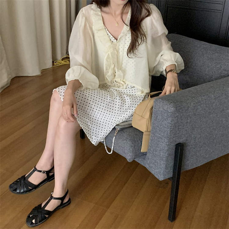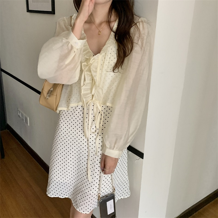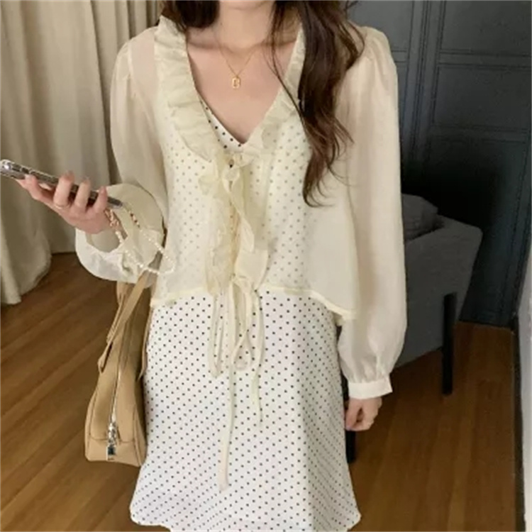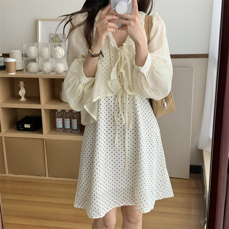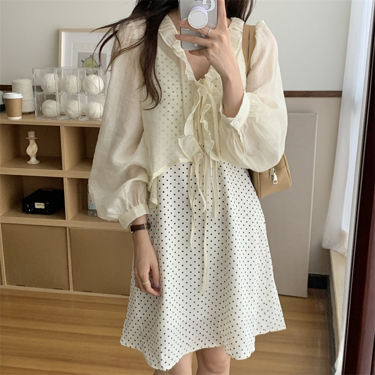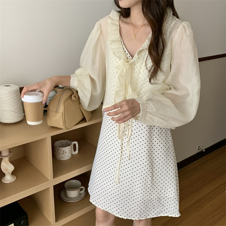 上品な白ワンピースの魅力を引き立てる、遊び心溢れる水玉柄のキャミソールワンピースとカーディガンのセット。 ブイネック仕様でフェミニンさを演出し、レースアップデザインがアクセントに。 素材:ポリエステル・綿 カラー:ベージュ(カーディガン)・白地水玉(キャミワンピース)