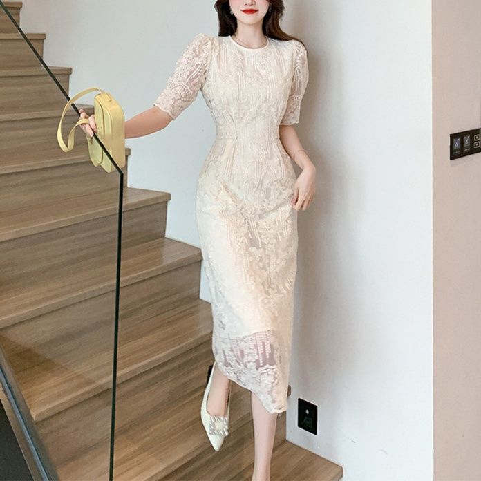 繊細な総レースとパフスリーブが女性らしい優雅さを演出し、ミモレ丈で品のある仕上がりに。