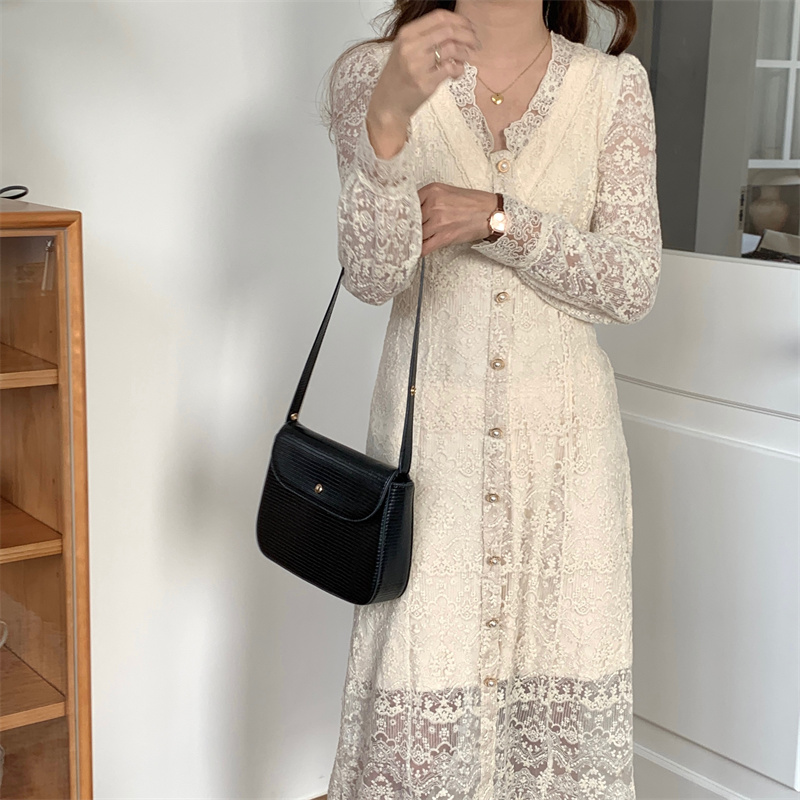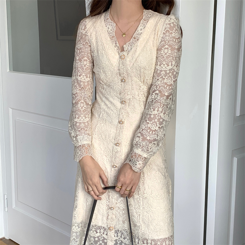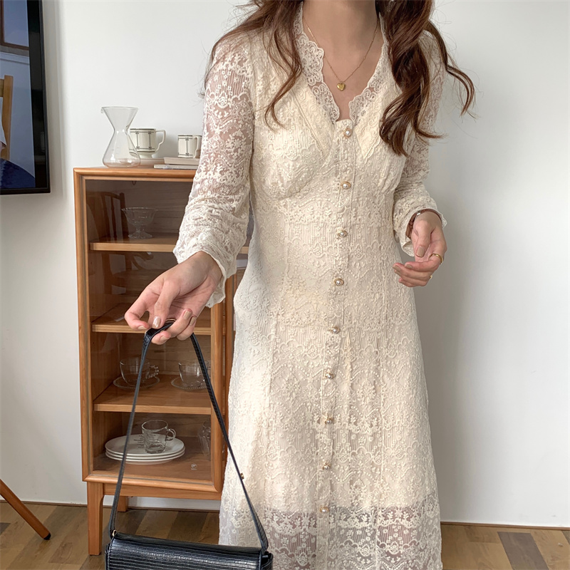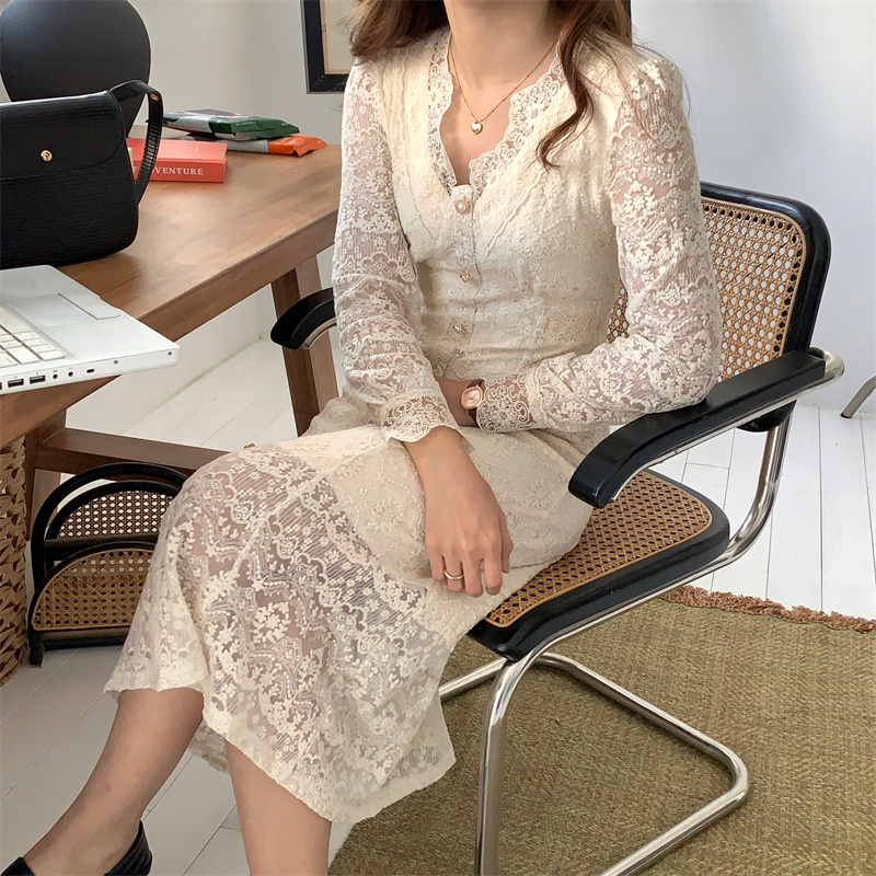 繊細なレースと透かし彫りが美しい白ワンピースです。 上品なブイネックラインが女性らしさを演出し、韓国風のエレガントなデザインが魅力的。 白ワンピース専門店ならではの上質な仕上がりで、特別な日にもぴったりです。