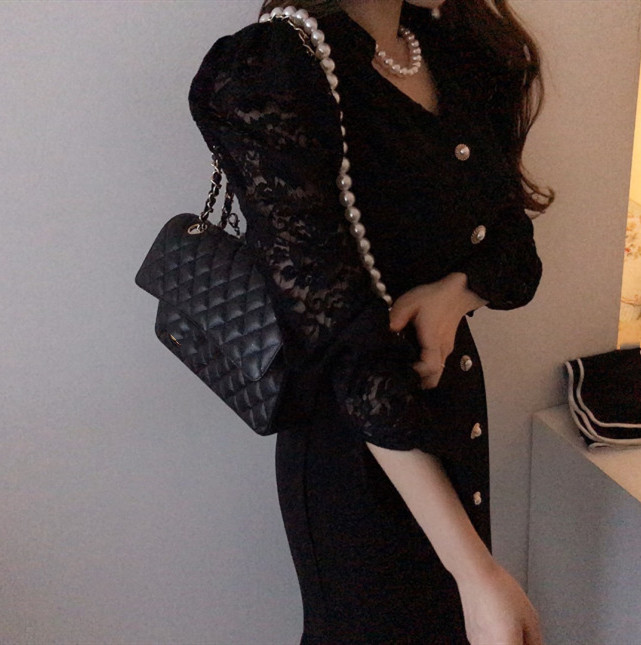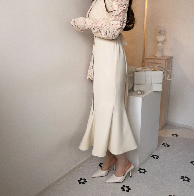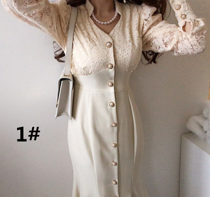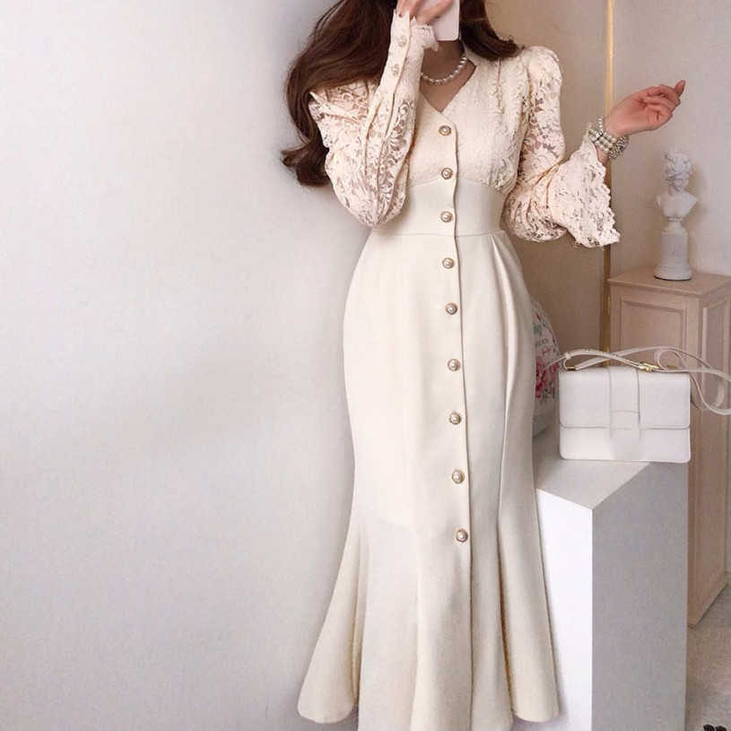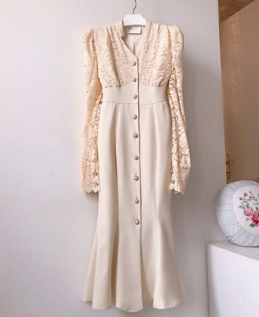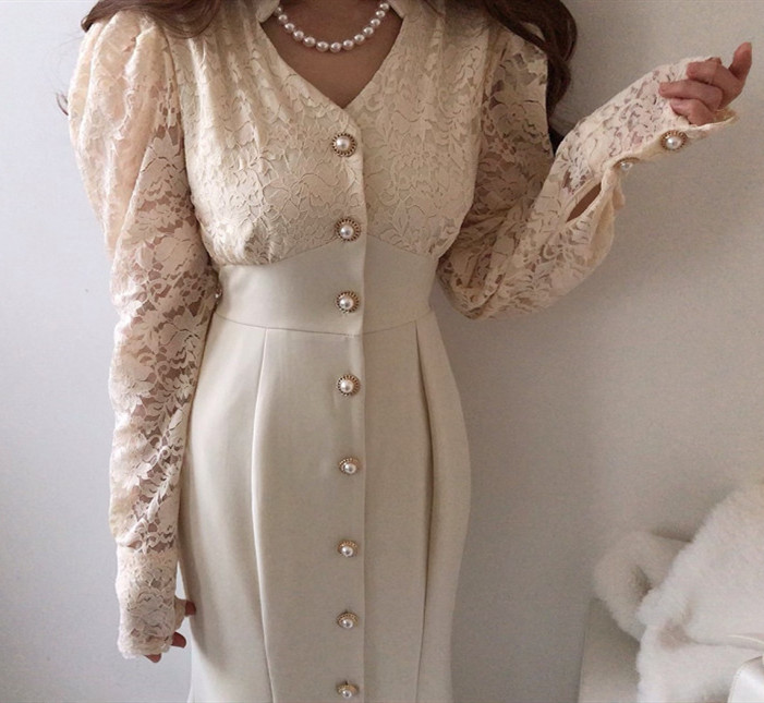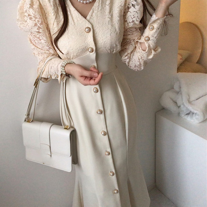 これからのシーズンに大人気な白ワンピースです。 袖部分の繊細なレース使いが上品で、フロントボタンがアクセントになった美しいロング丈デザイン。 デイリー使いから特別な日まで幅広く活躍する、一着持っていると重宝するワンピースです。