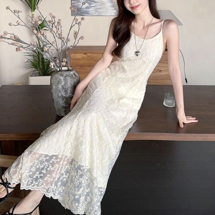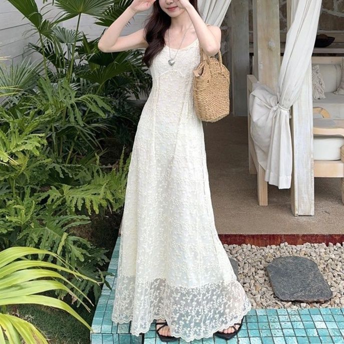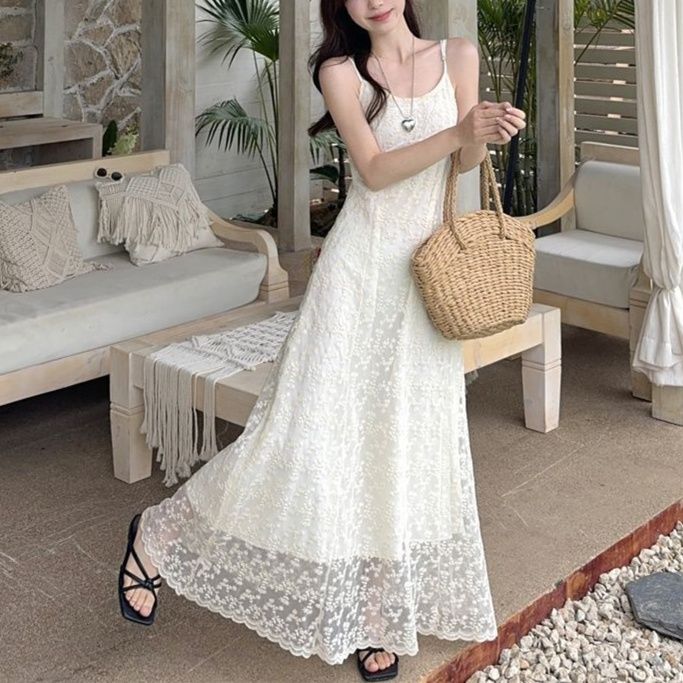 リゾートにもデイリーにも活躍する白ワンピースです。 全体を覆う繊細な花柄レースが女性らしさを引き立て、透け感のある裾部分が軽やかな印象を演出します。 細めのキャミソール肩紐と胸元の優しいデザインが華奢見え効果を発揮し、すっきりとしたシルエットで体型カバーも叶います。 ロング・マキシワンピならではの上品な丈感で、リラックスした雰囲気ながらもきちんと感を保ち、様々なシーンで着回せる一枚です。