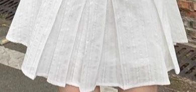 ボディ部分は縦ストライプの刺繍とピンタック加工で立体感を演出し、ウエストから広がるプリーツスカートが軽やかに揺れる女性らしいシルエットが魅力です。
