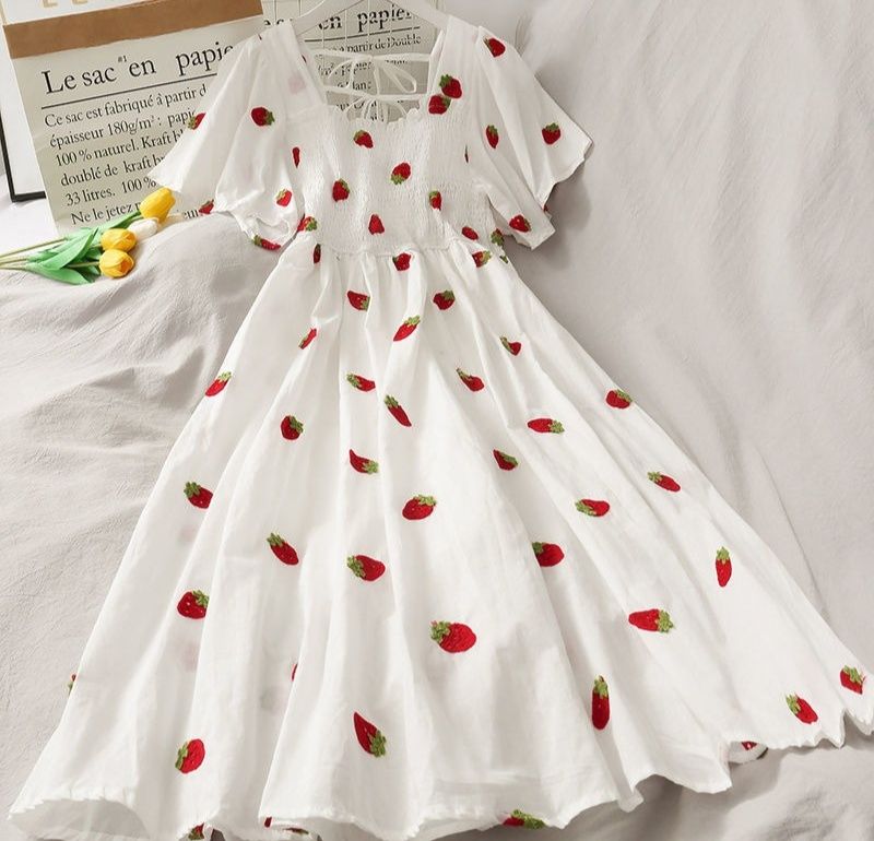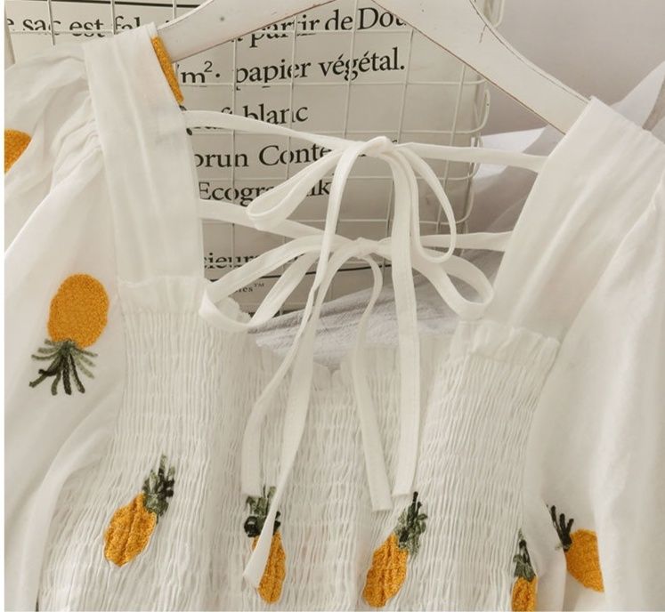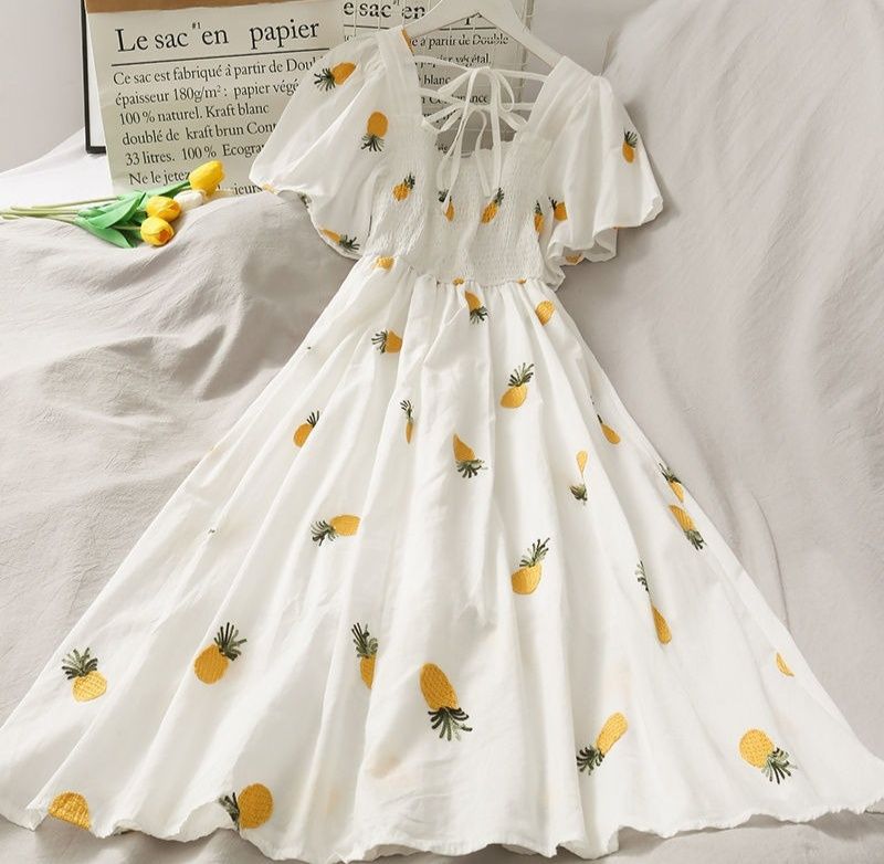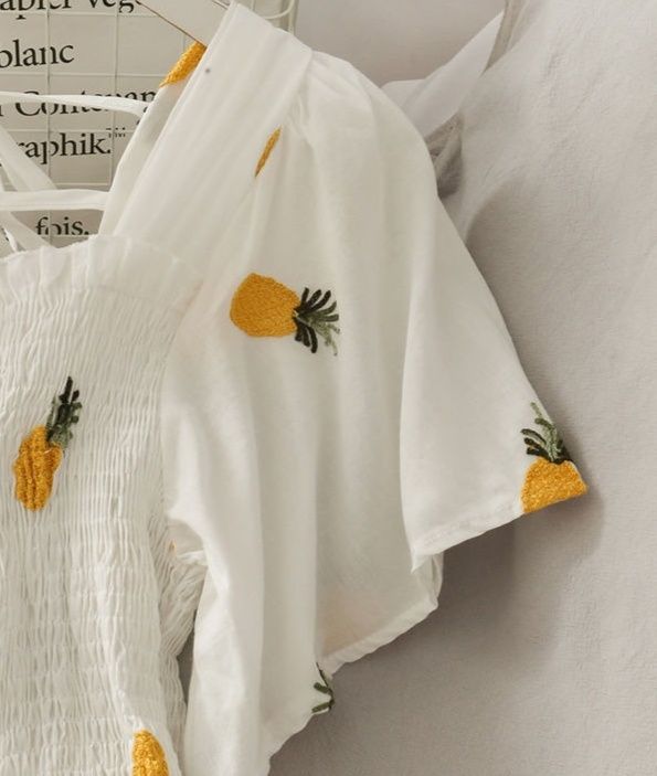 苺やパイナップルの刺繍が夏らしさを引き立て、デートやお出かけにぴったりの一枚です。