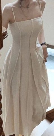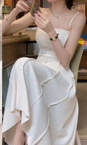 華奢な細紐のキャミソールデザインに、エレガントなオフショルダーの袖を組み合わせた白ワンピースです。