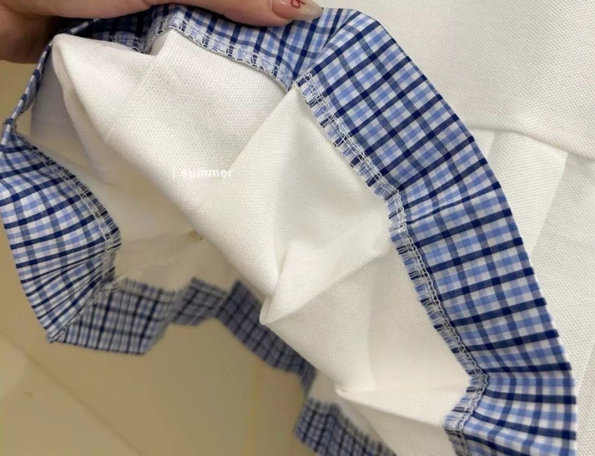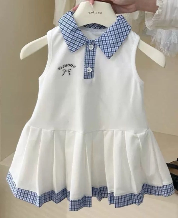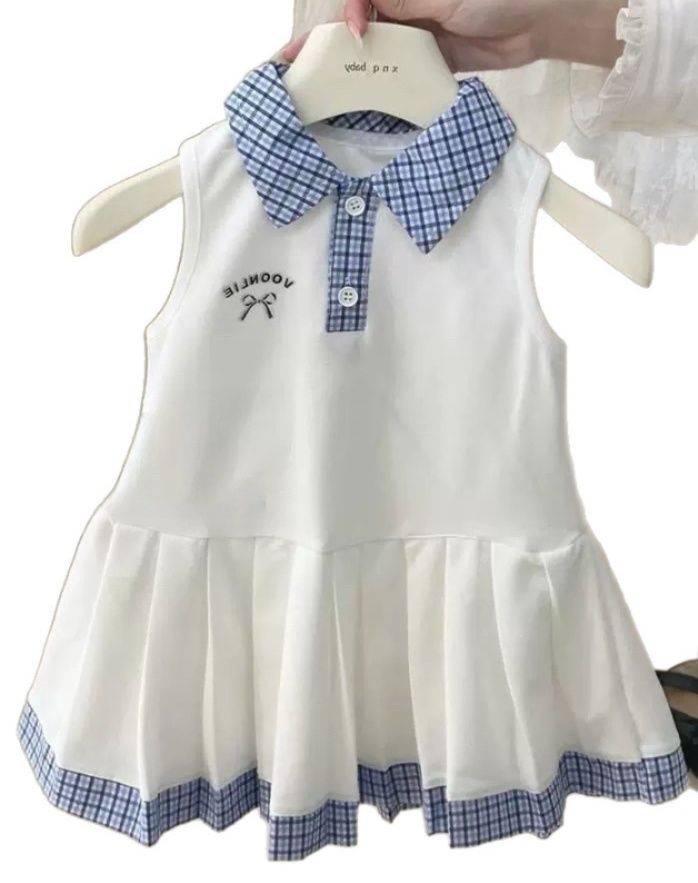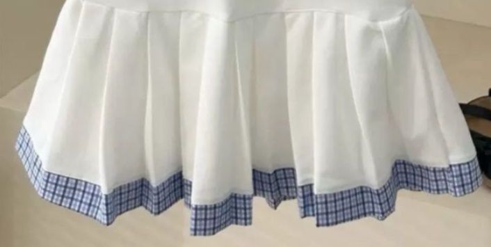 裾にはたっぷりとしたプリーツとチェック柄の縁取りを施し、動くたびにふんわりと揺れる愛らしいシルエットが魅力です。