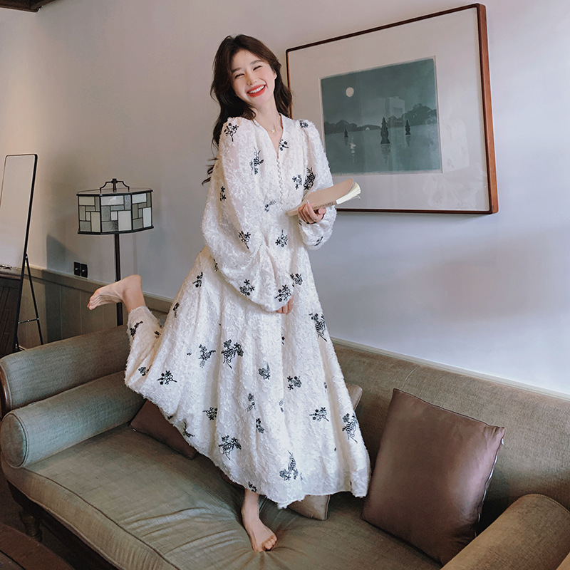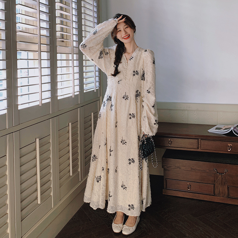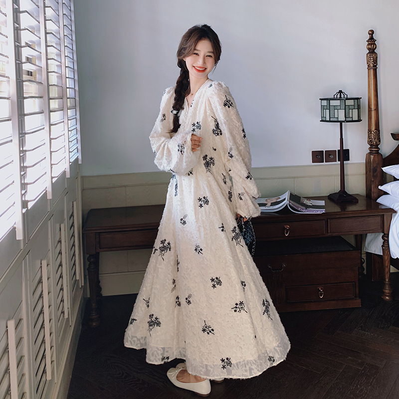 上品な小花刺繍が美しい白ワンピースのロングマキシワンピースです。