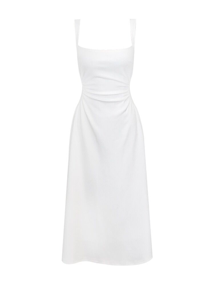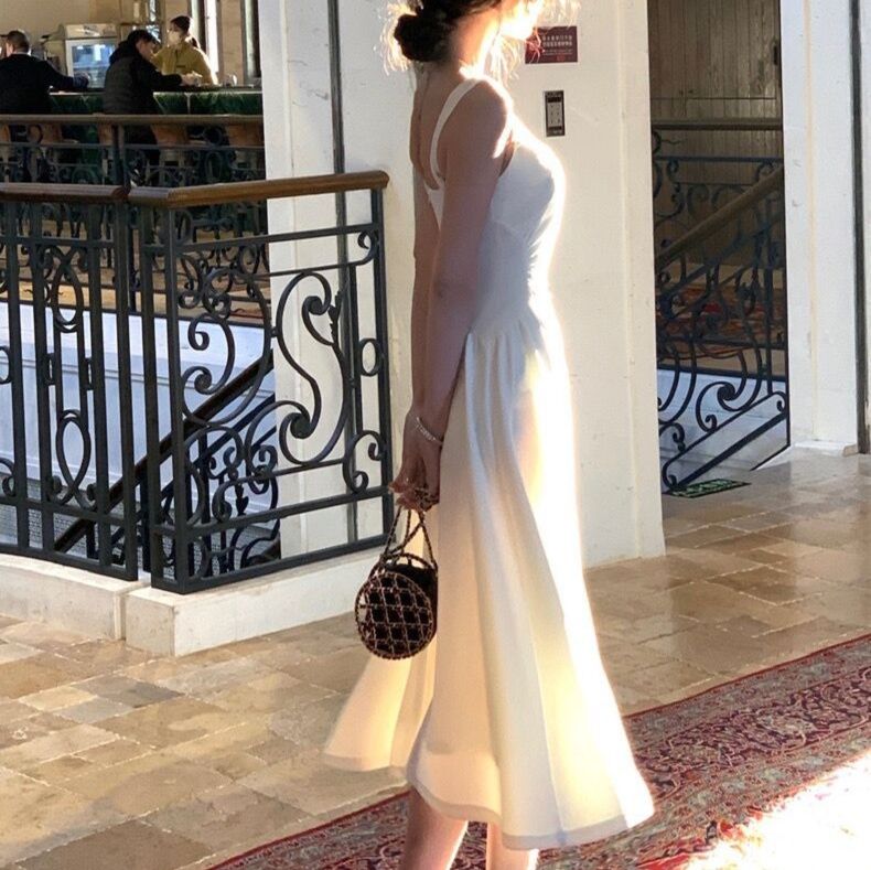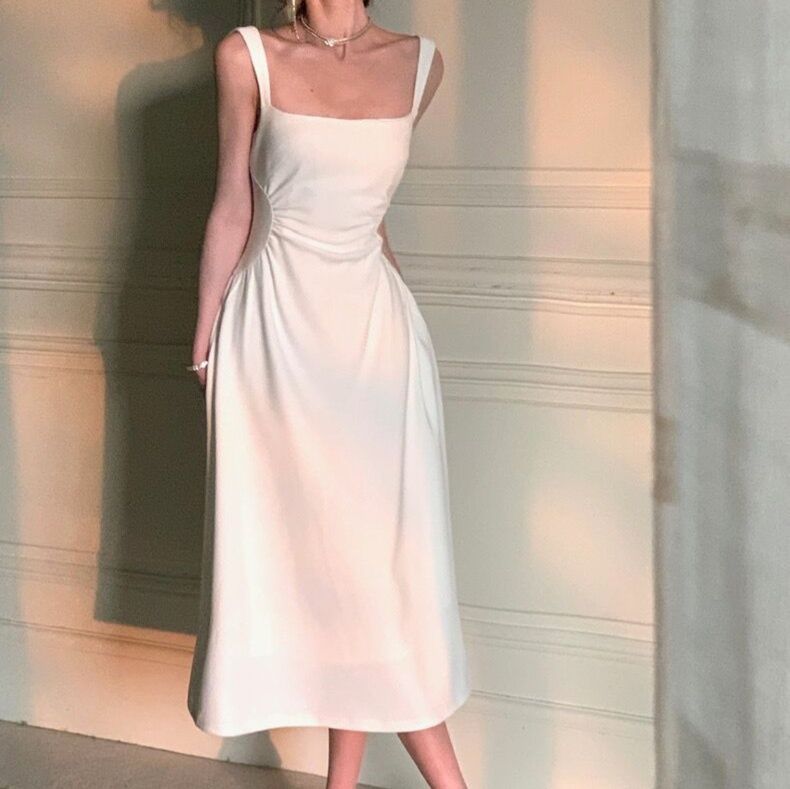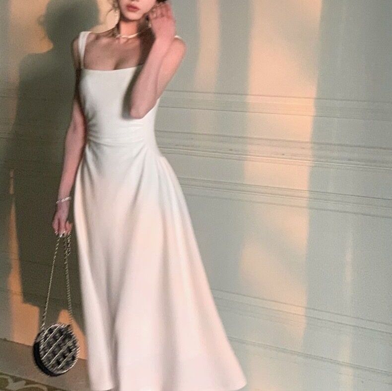 上品なスクエアネックと太めのストラップが特徴的な白ワンピースです。