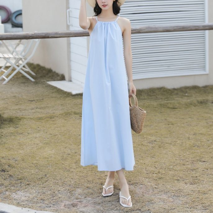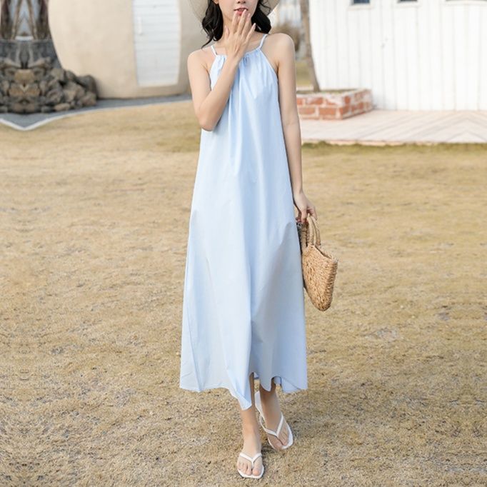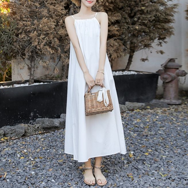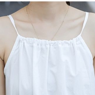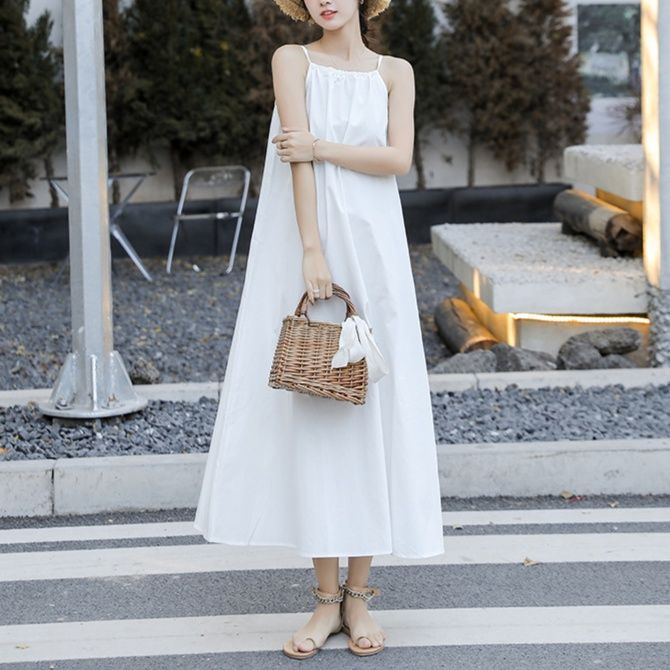 涼しげな細い紐が特徴のキャミソールデザインの白ワンピースです。