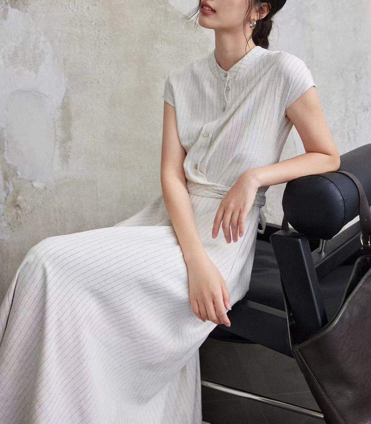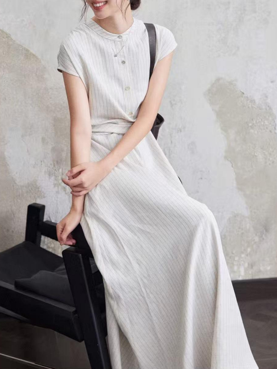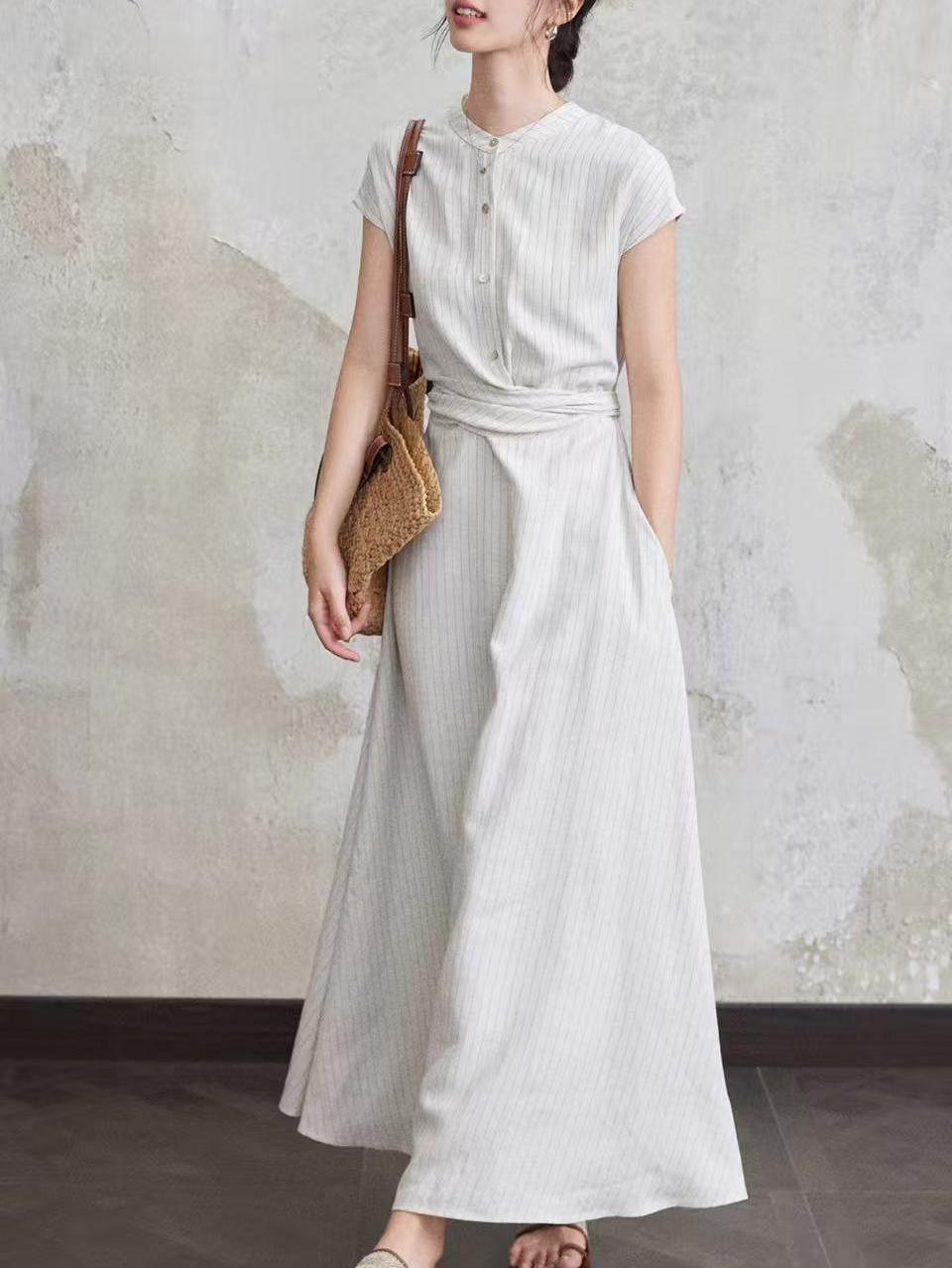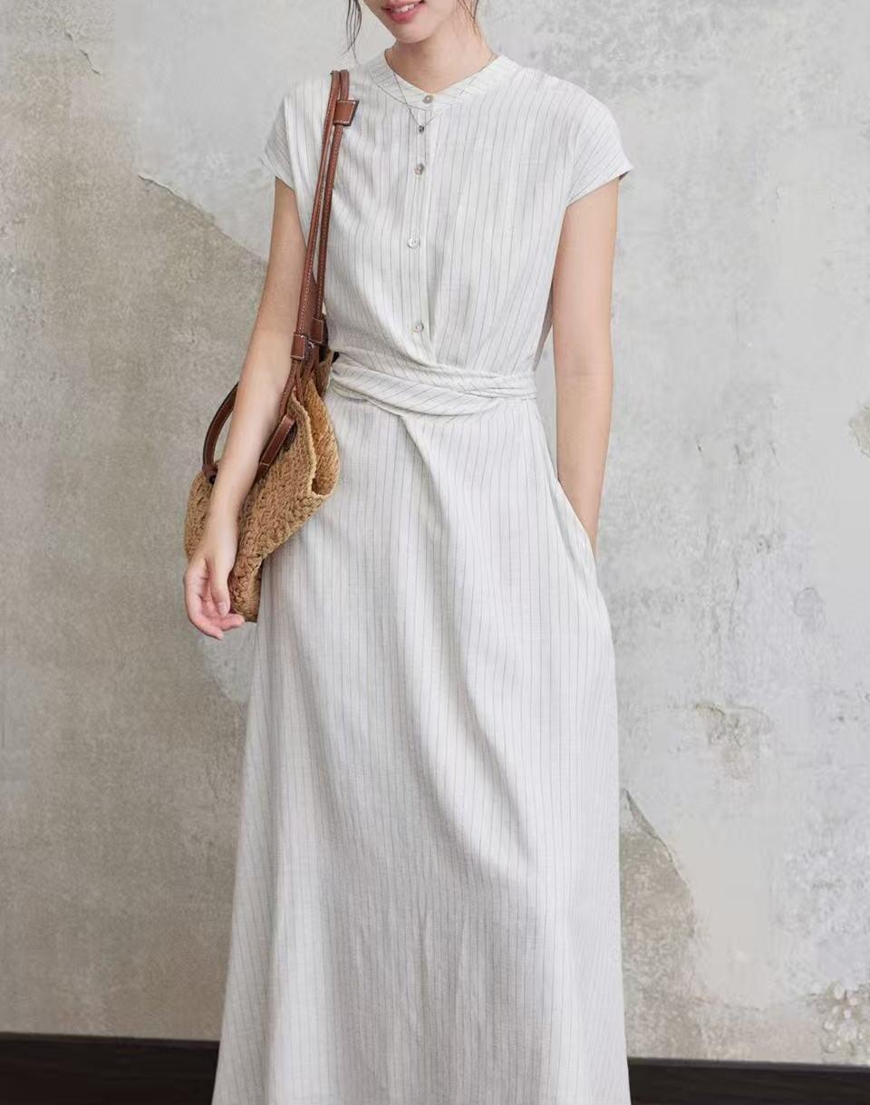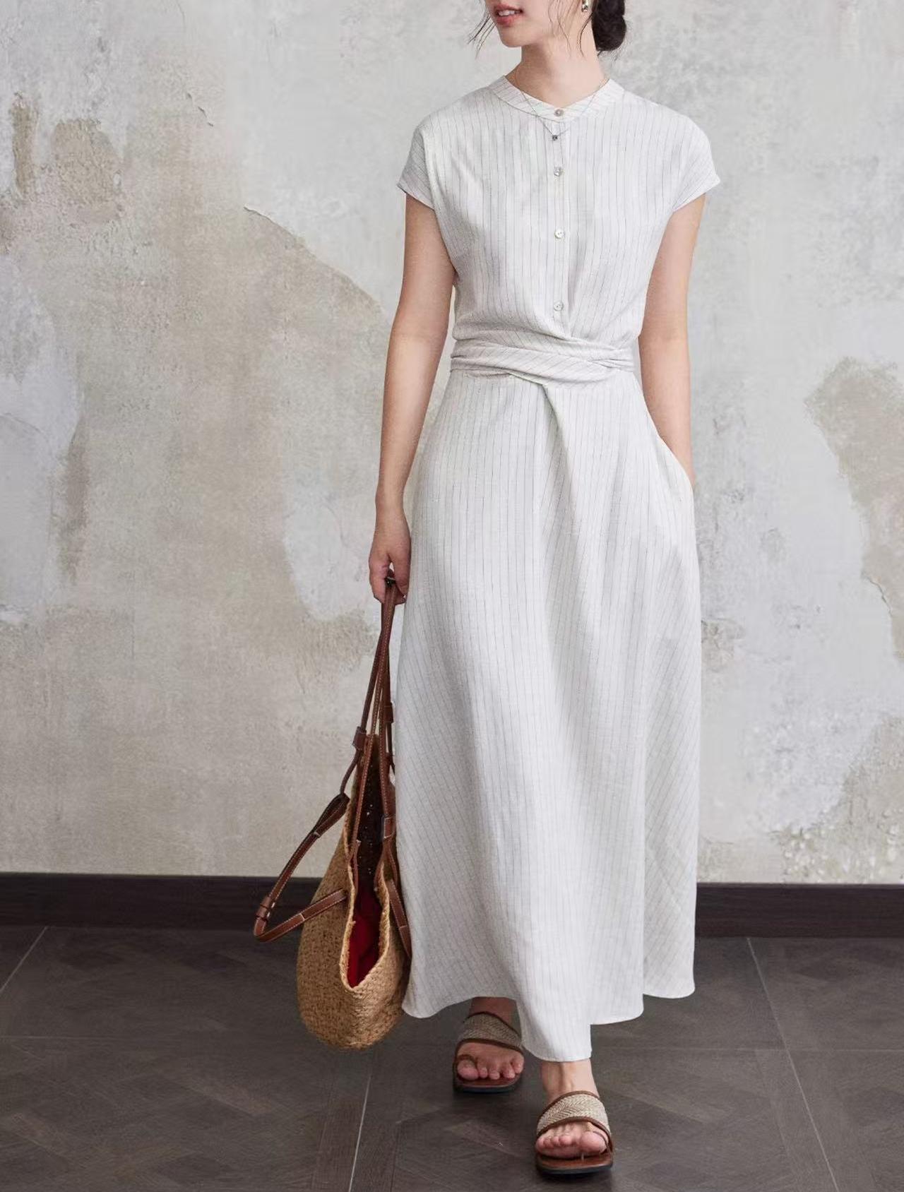 涼しげなストライプ柄が上品な印象を与える白ワンピースです。