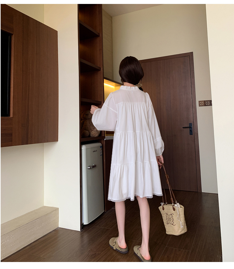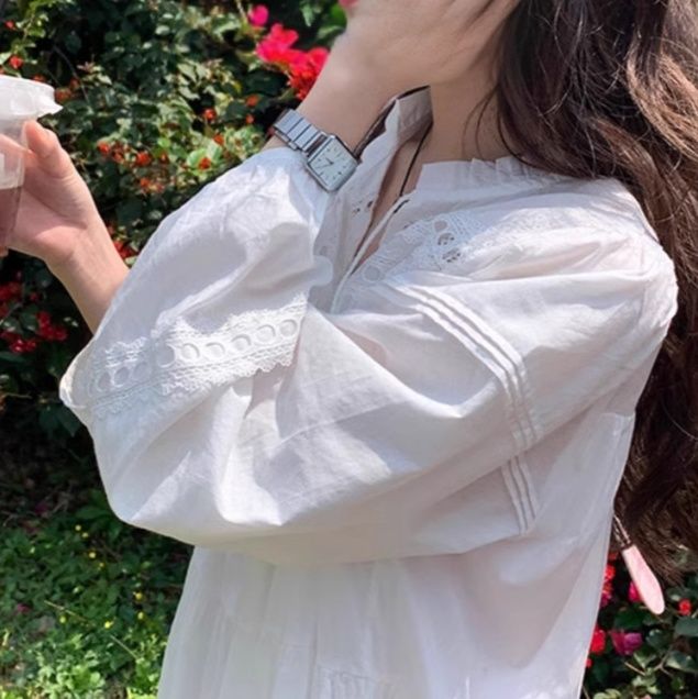襟元のレース装飾と袖口のギャザーが上品な印象を演出します。