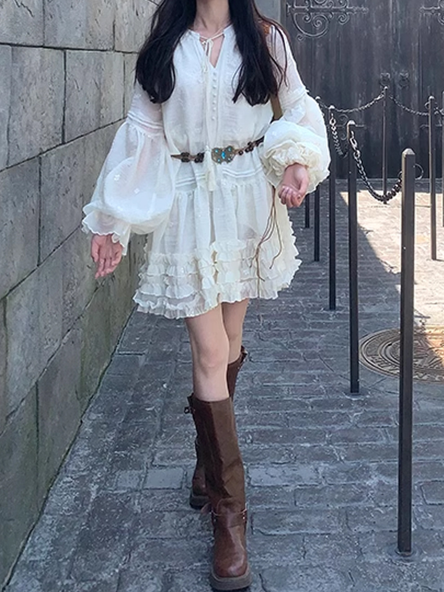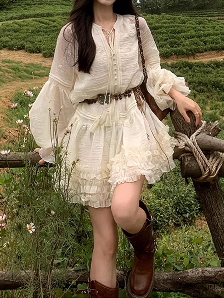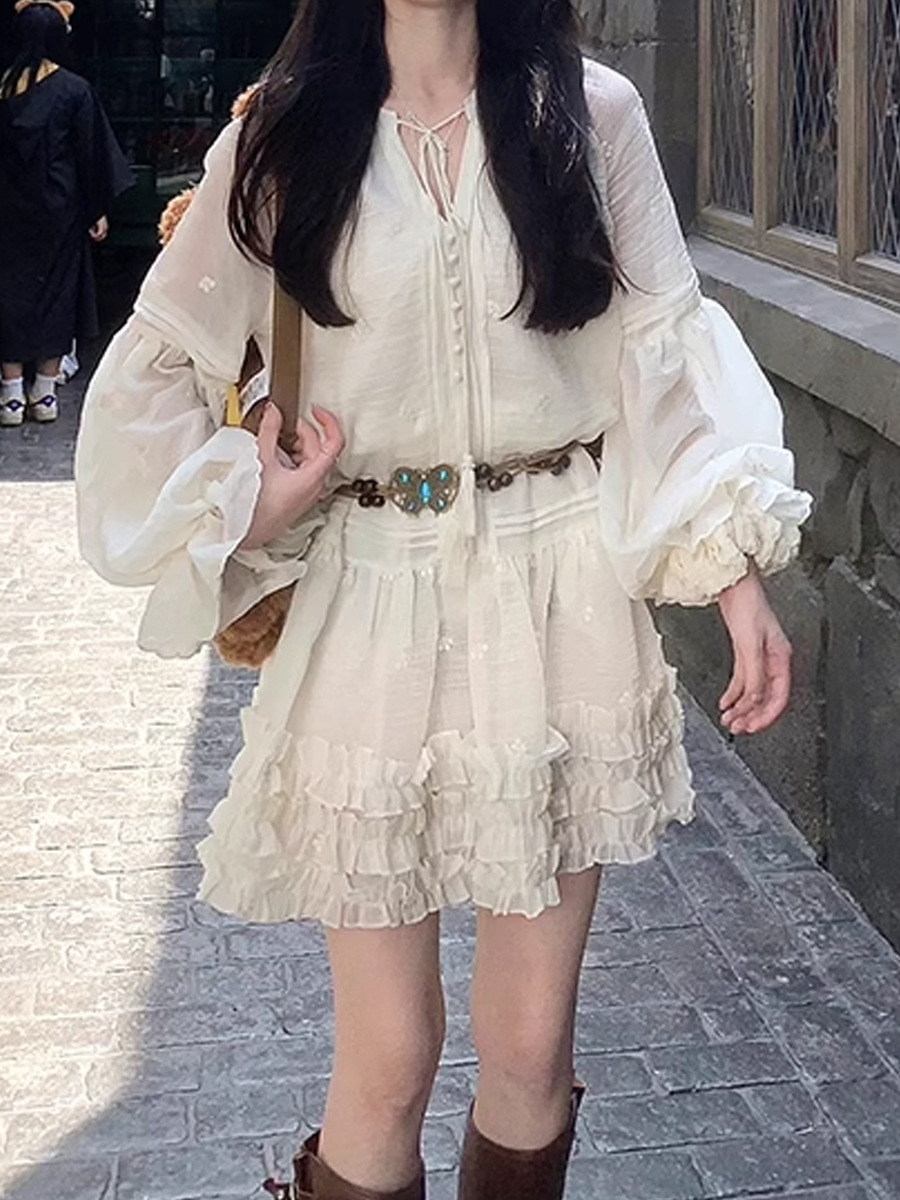 ふんわりと広がるティアードスカートが軽やかで、春夏のお出かけやピクニックにぴったりの一着です。