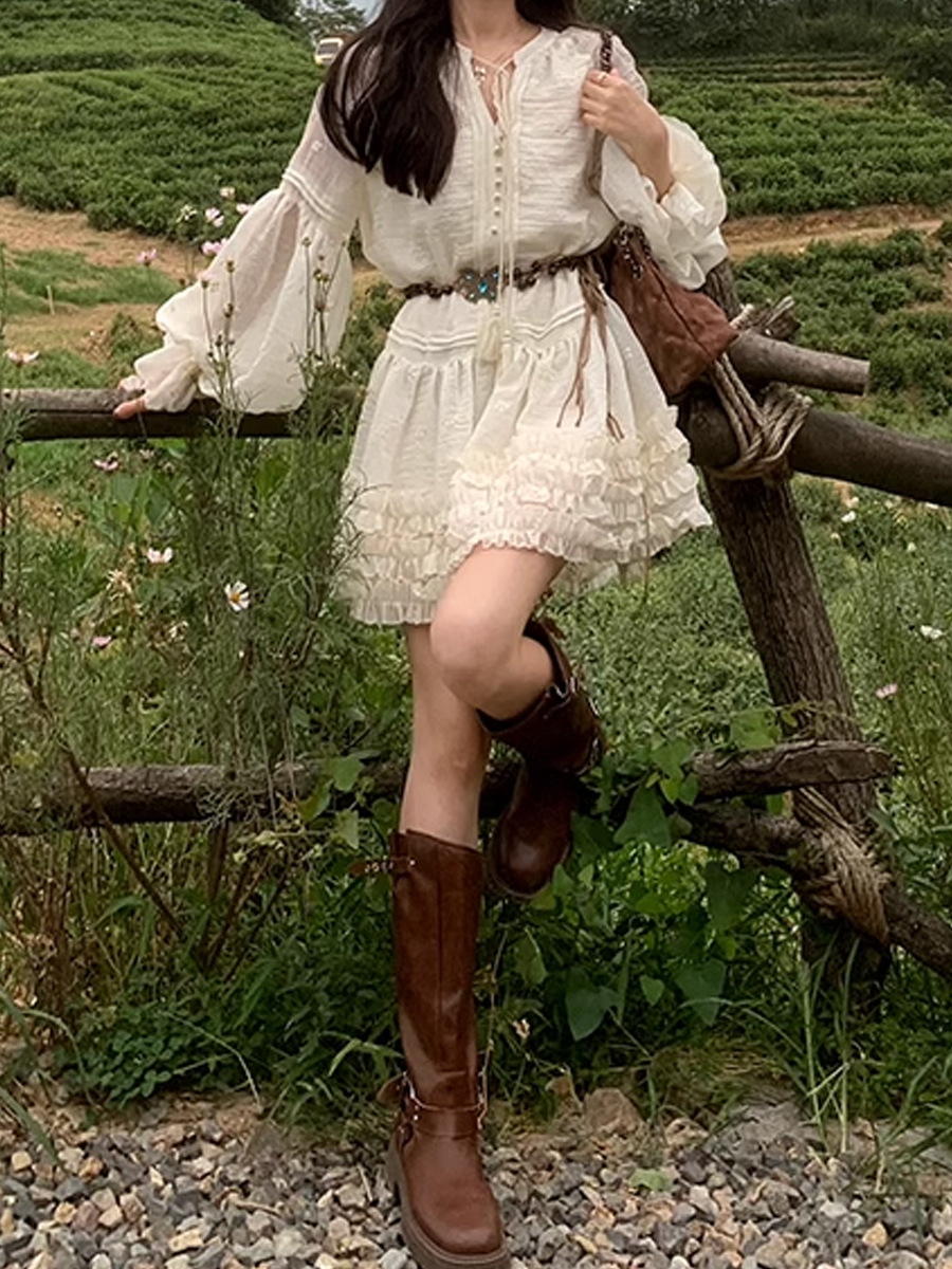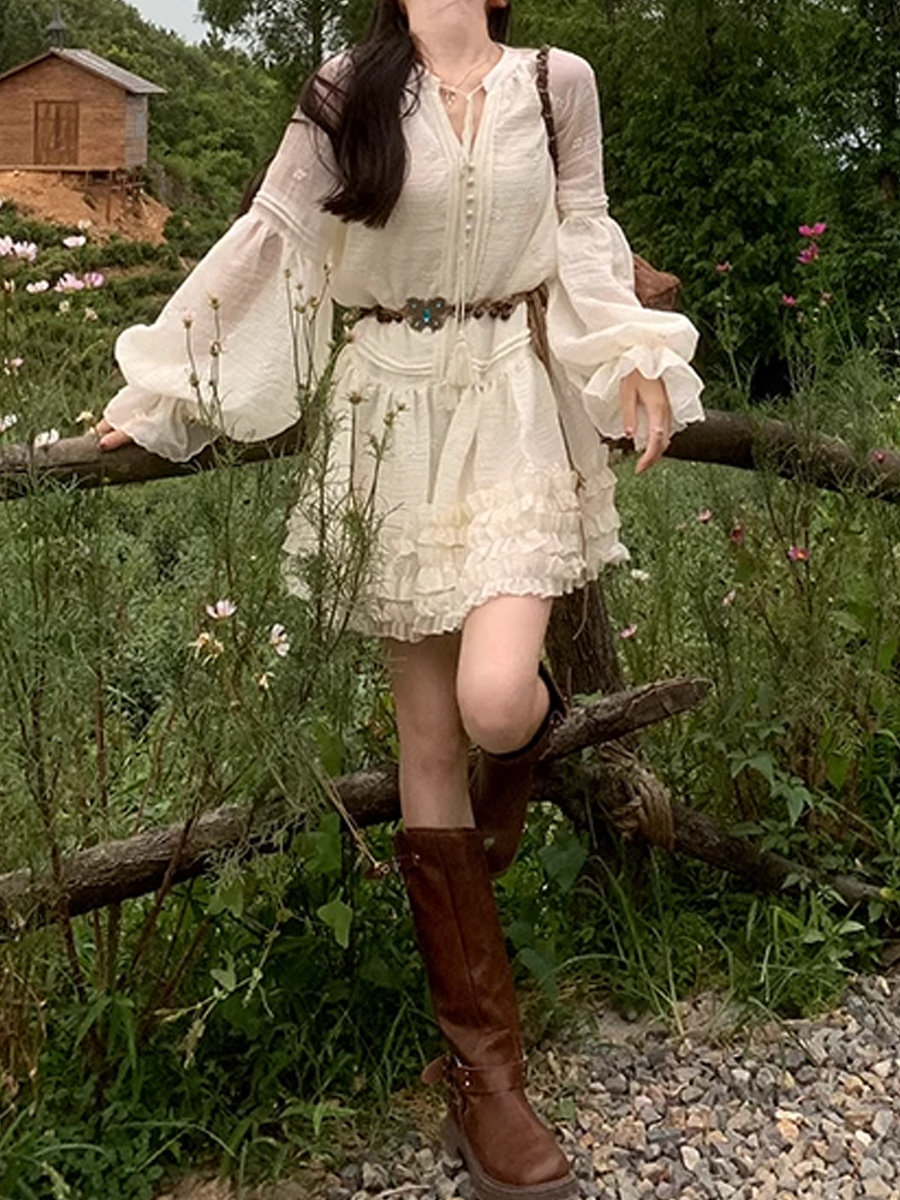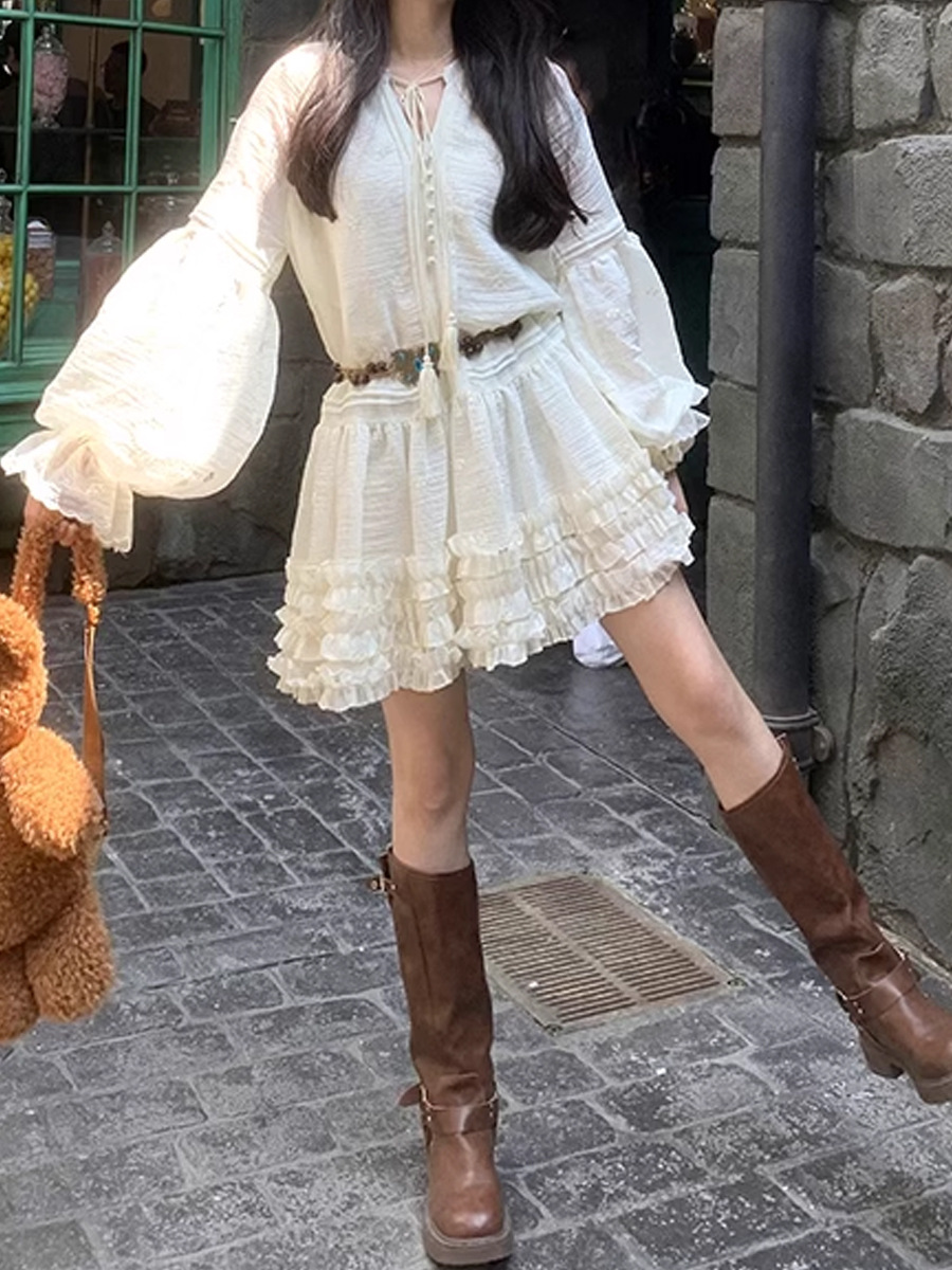 ふんわりと広がるティアードスカートが軽やかで、春夏のお出かけやピクニックにぴったりの一着です。