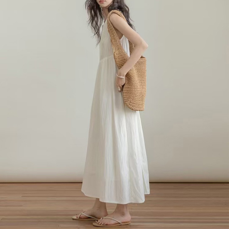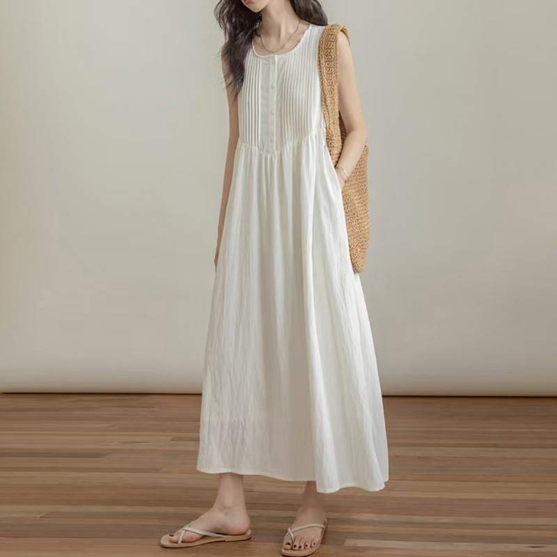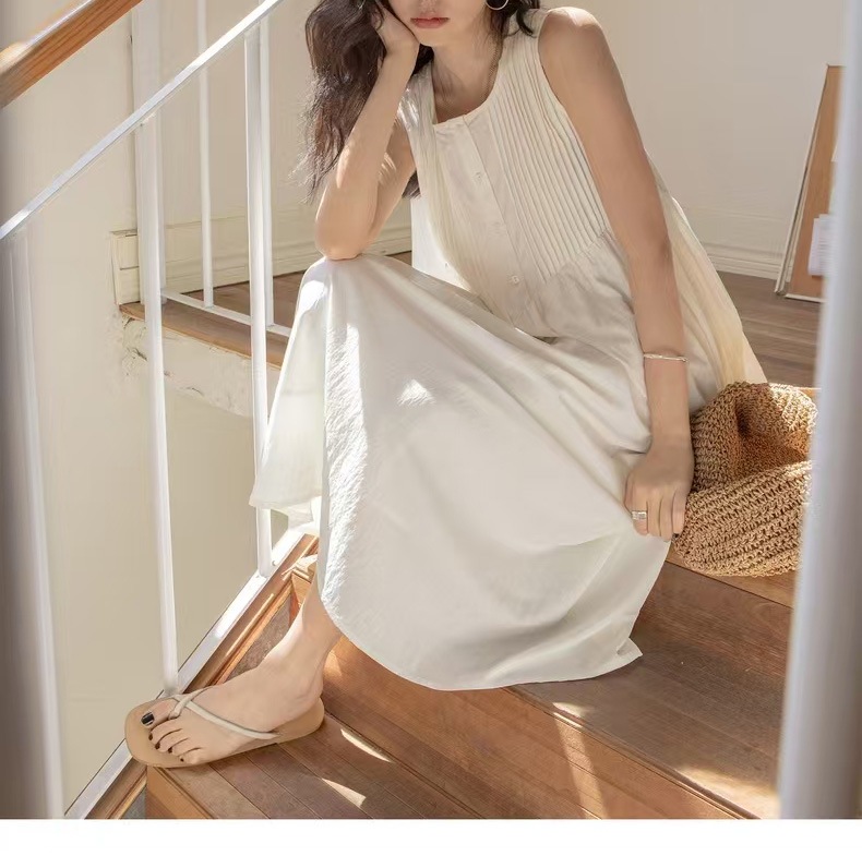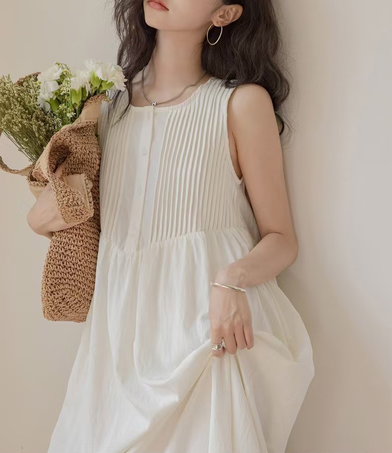 胸元の繊細なピンタックが上品な印象を演出する白ワンピースです。