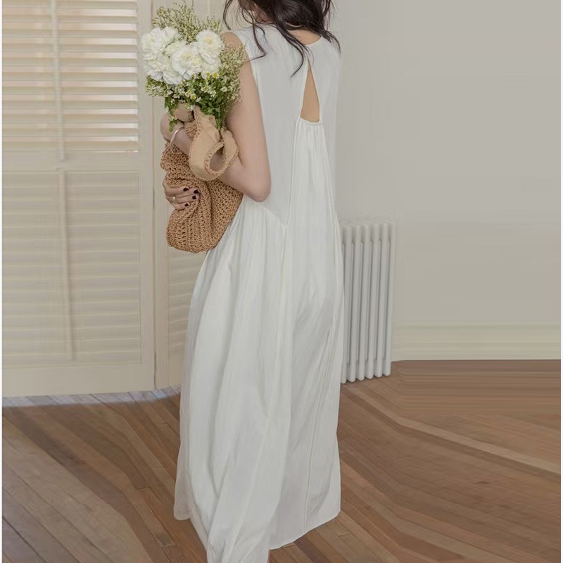 ノースリーブデザインで涼しげな着心地を実現し、切替部分から広がるゆったりとしたシルエットが体型をカバーしながら優雅な雰囲気を醸し出します。