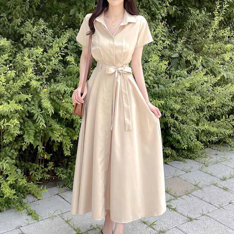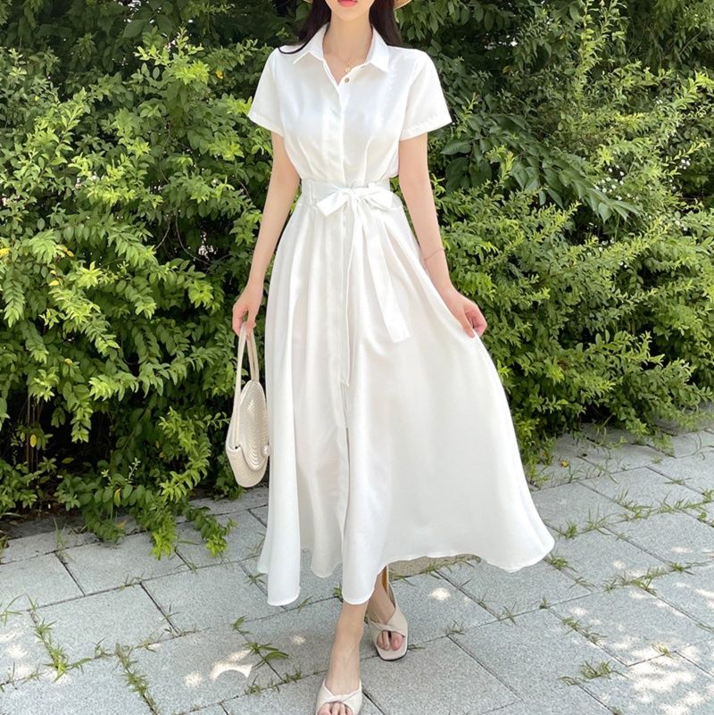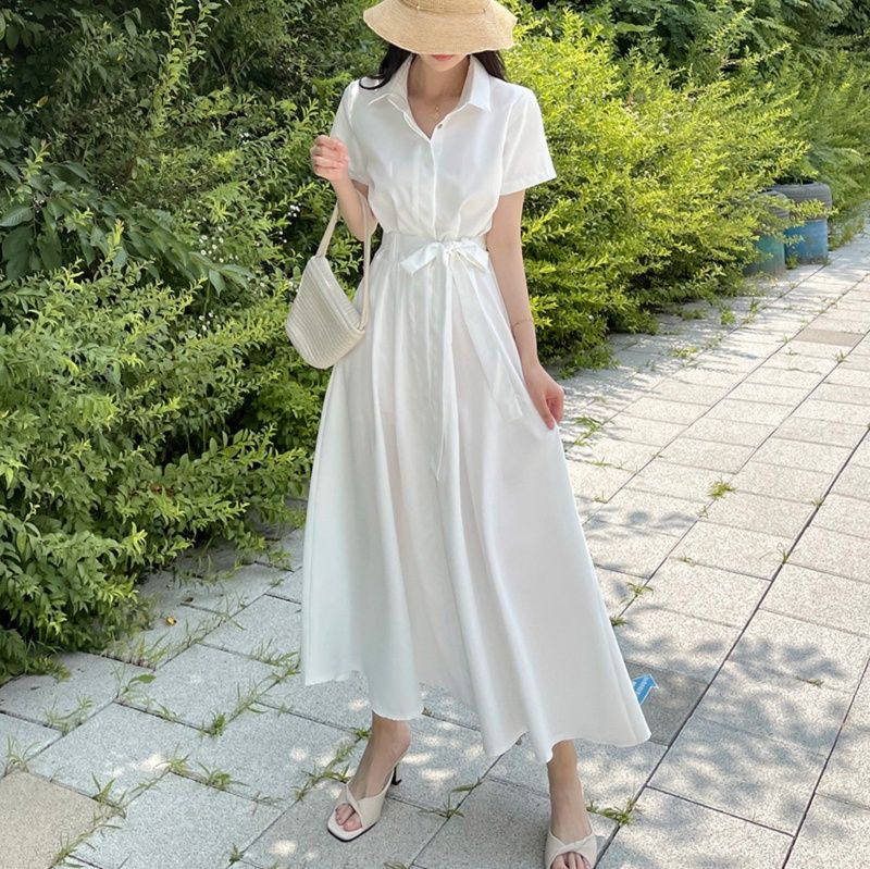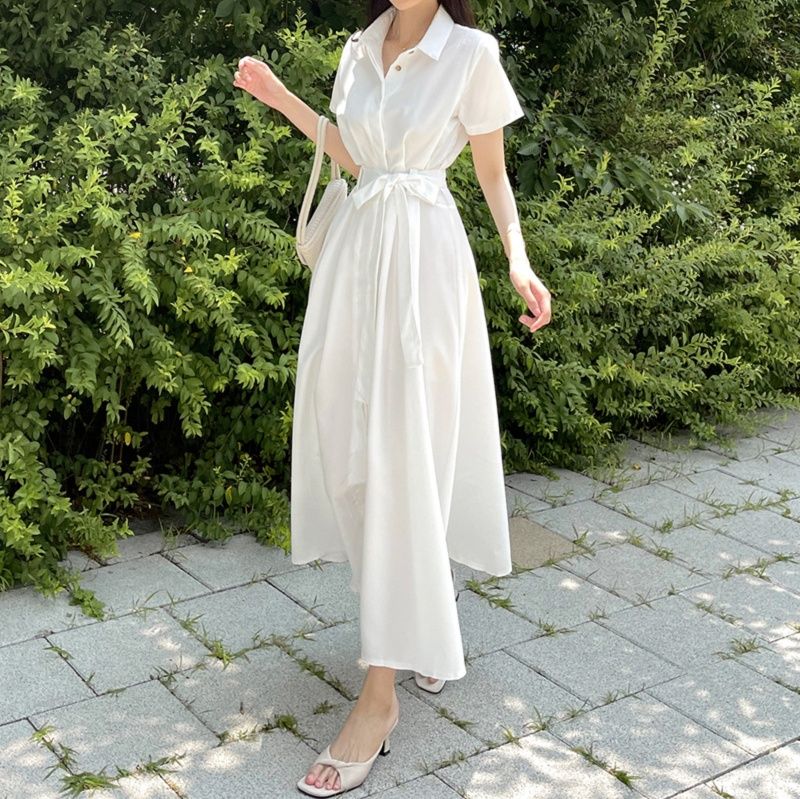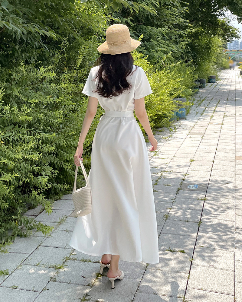 清涼感溢れる襟付きデザインの白ワンピースです。 半袖の袖口とウエストのリボンベルトが女性らしさを引き立てます。 ふんわりと広がるロング・マキシワンピのスカート部分は歩くたびに優雅に揺れ、上品な印象を演出します。 夏のお出かけやリゾートシーンにぴったりの一枚です。 サンダルや帽子との相性も抜群で、涼しげなコーディネートが完成します。