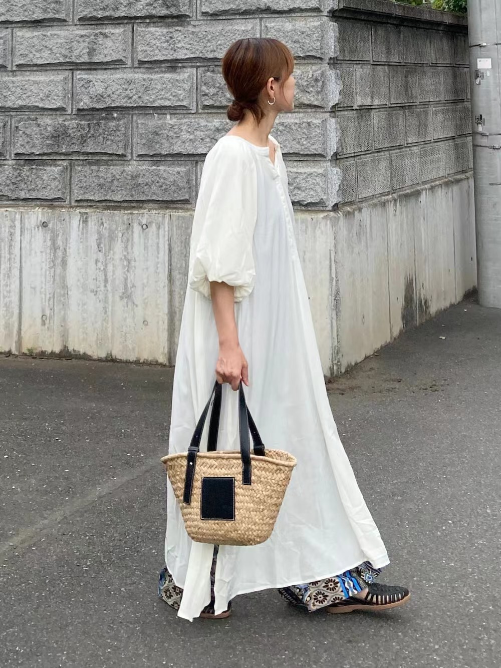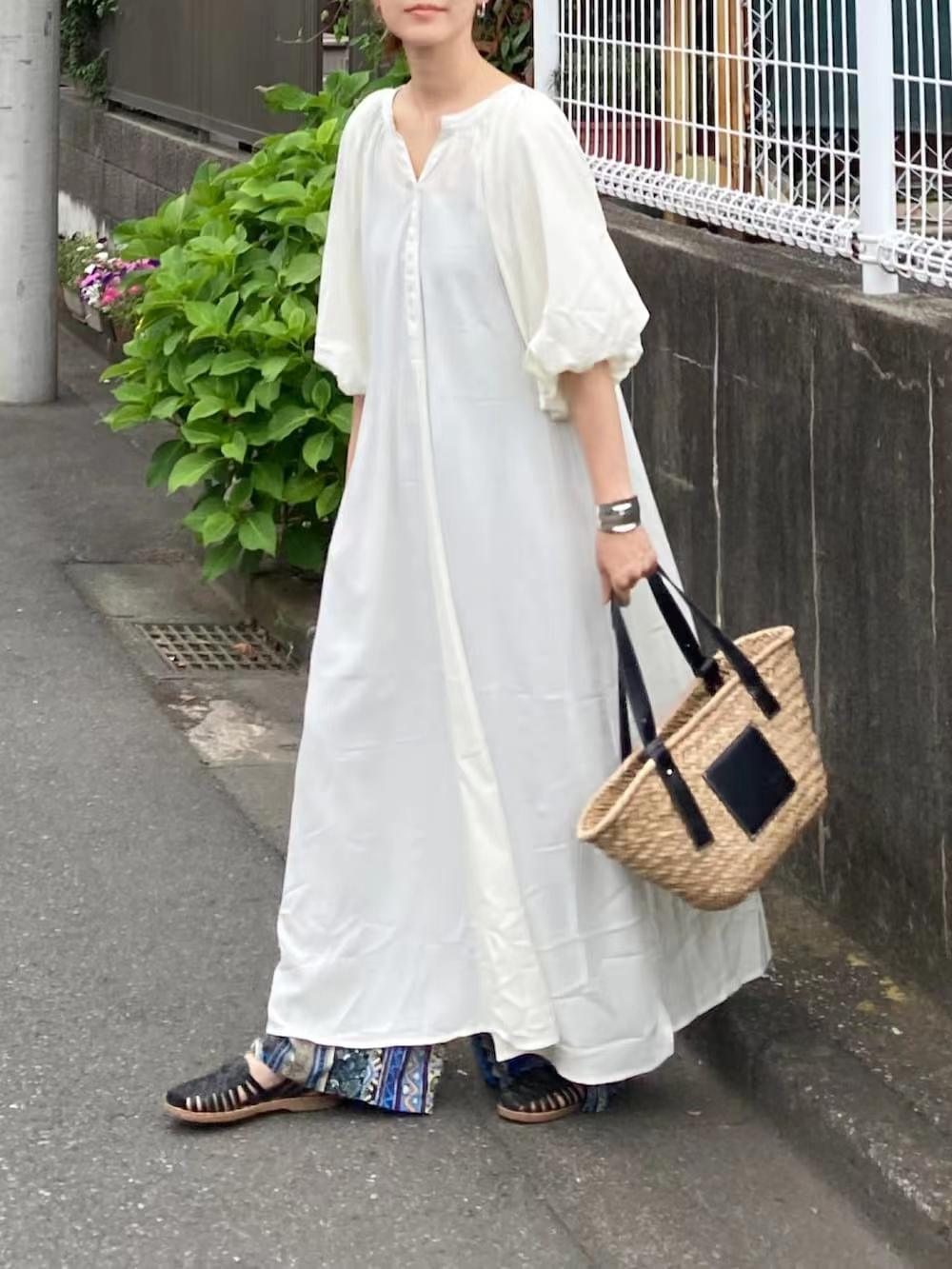 ふんわりとしたバルーン袖が印象的な白ワンピースです。
