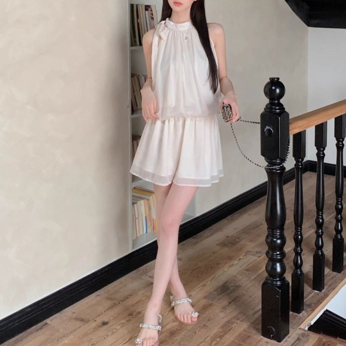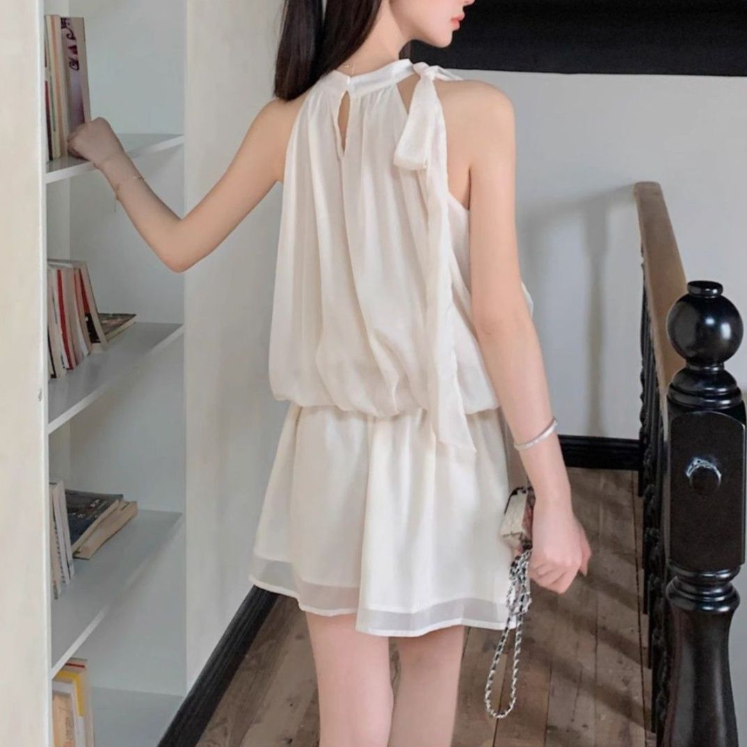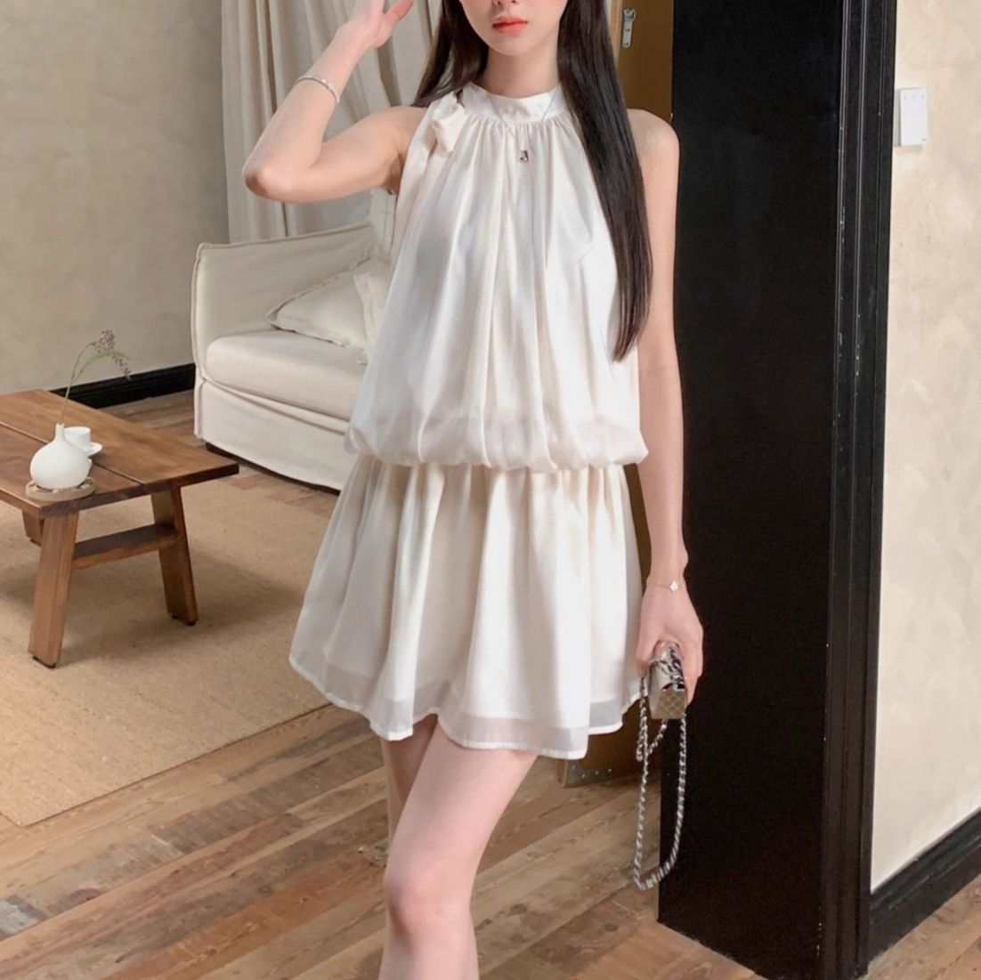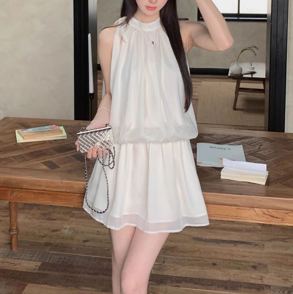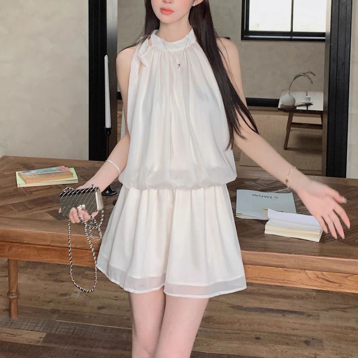 首元のホルターネックデザインが清楚で上品な印象を与える白ワンピースです。