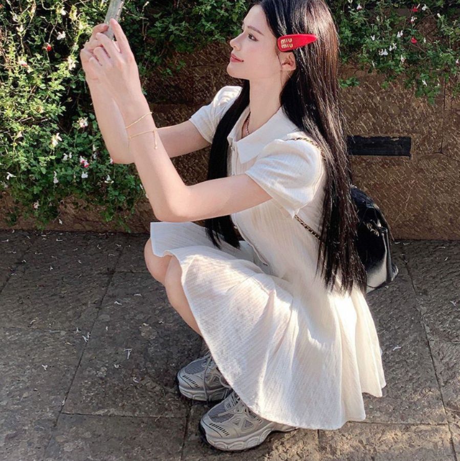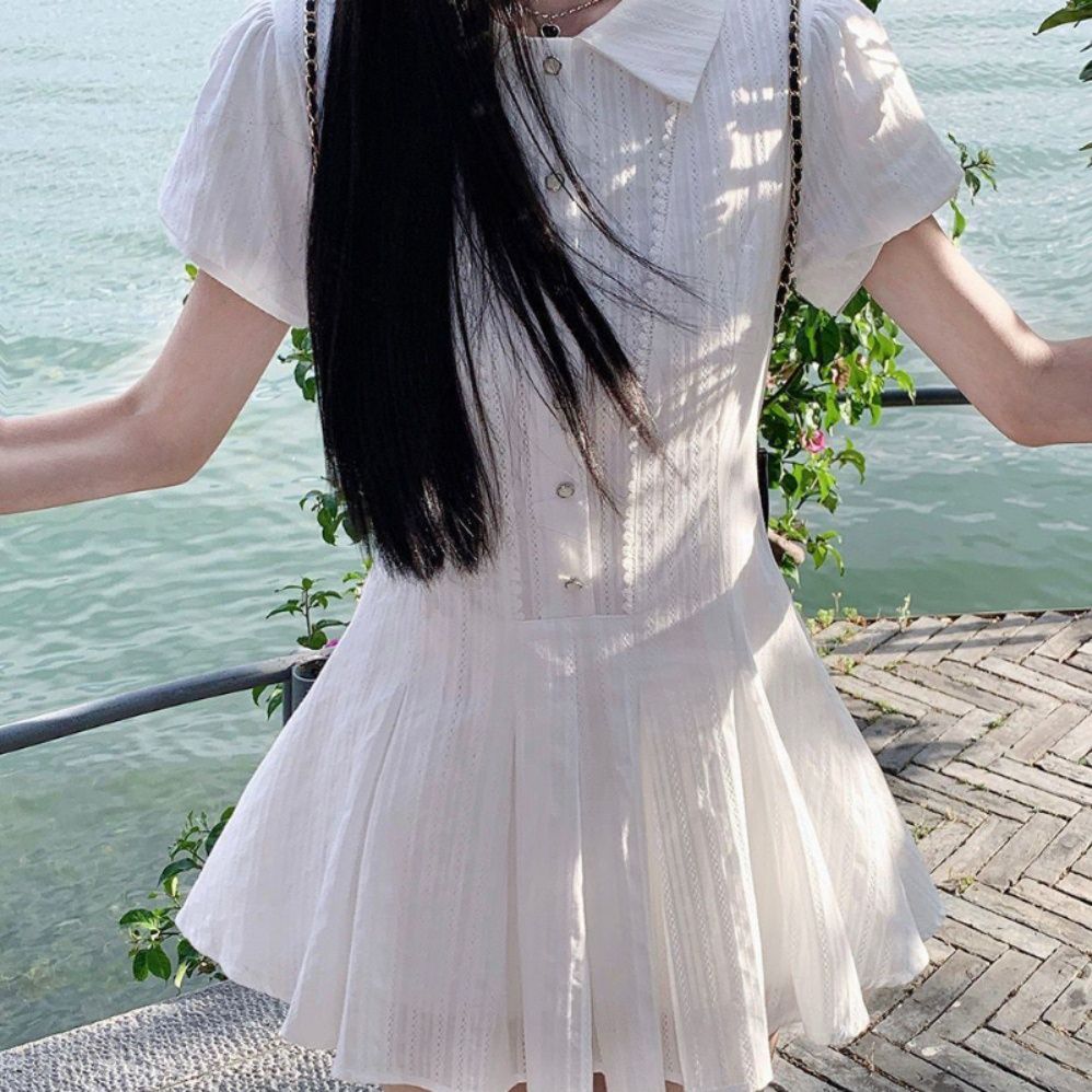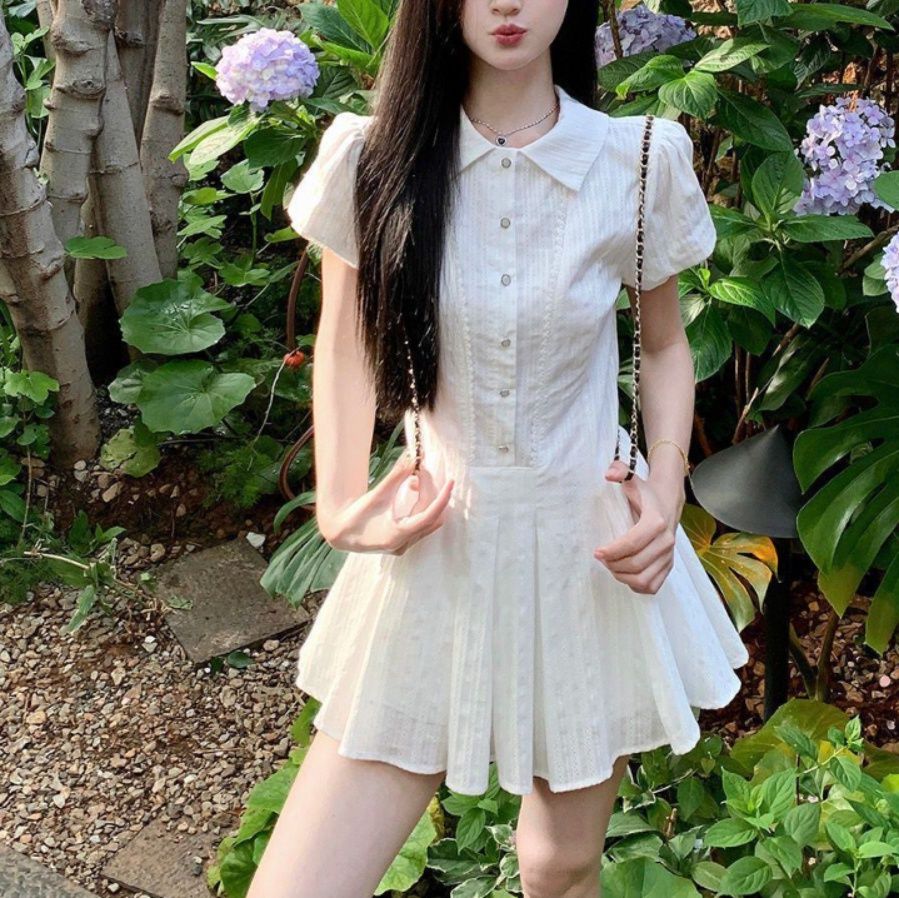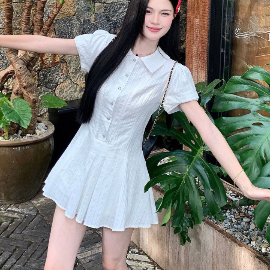 フロントのボタンディテールと裾に広がるプリーツスカートが軽やかな印象を与えるミニ・ミディワンピです。