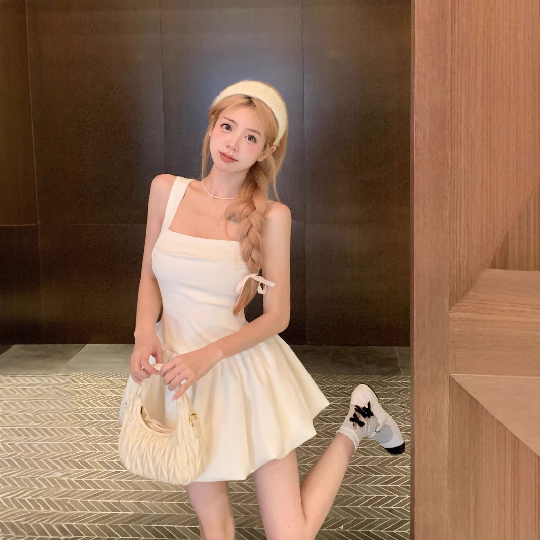 すっきりとしたスクエアネックとサイドのリボンディテールが愛らしいミニ・ミディワンピです。