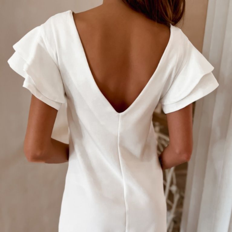 華やかなフリル袖と背中の深めの開きが女性らしさを演出し、後ろ姿まで美しく魅せるミニ・ミディワンピです。