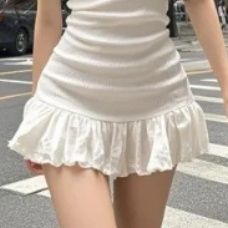 リブ素材のフィットシルエットが女性らしい体型を演出し、裾のフリルデザインが可愛らしさをプラスします。